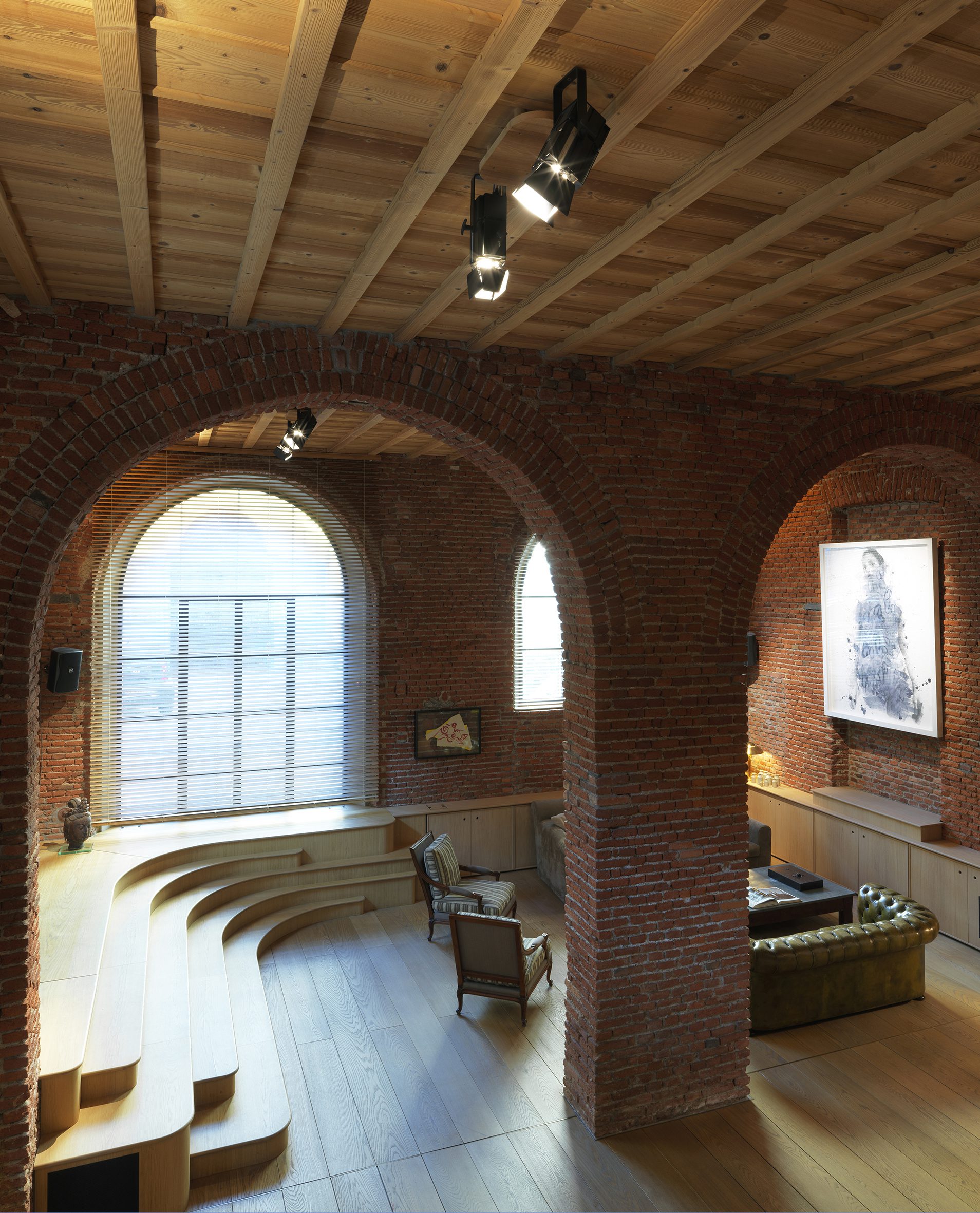 The original brick arches articulate the ambient, across a series of diagonal visual perspectives that allow simultaneously full view across the space by maintaining privacy where necessary.