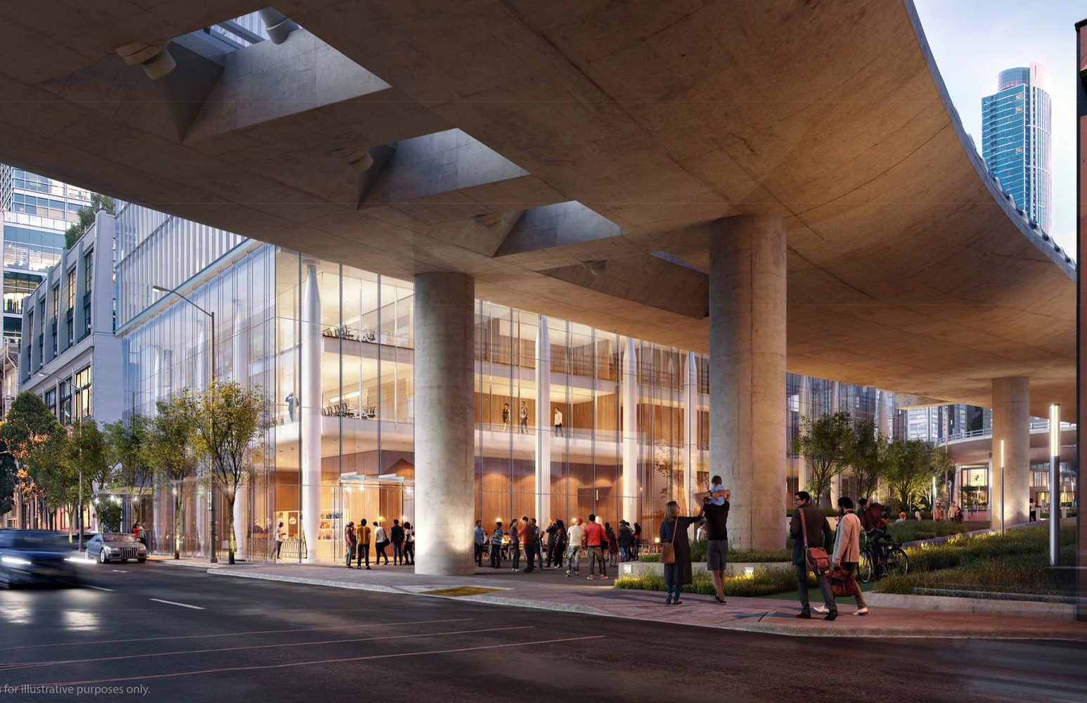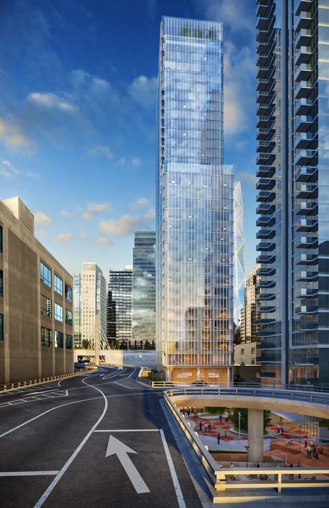 San Francisco’s Planning Department has released new renderings for the project, which shows a slick tower, entirely enveloped in the transparent curtain wall. The tower stands on a podium supported by thin round columns, pointed at both ends. The podium has a double-height ground floor and two cantilevered floors above, which will host the reception and retail space.