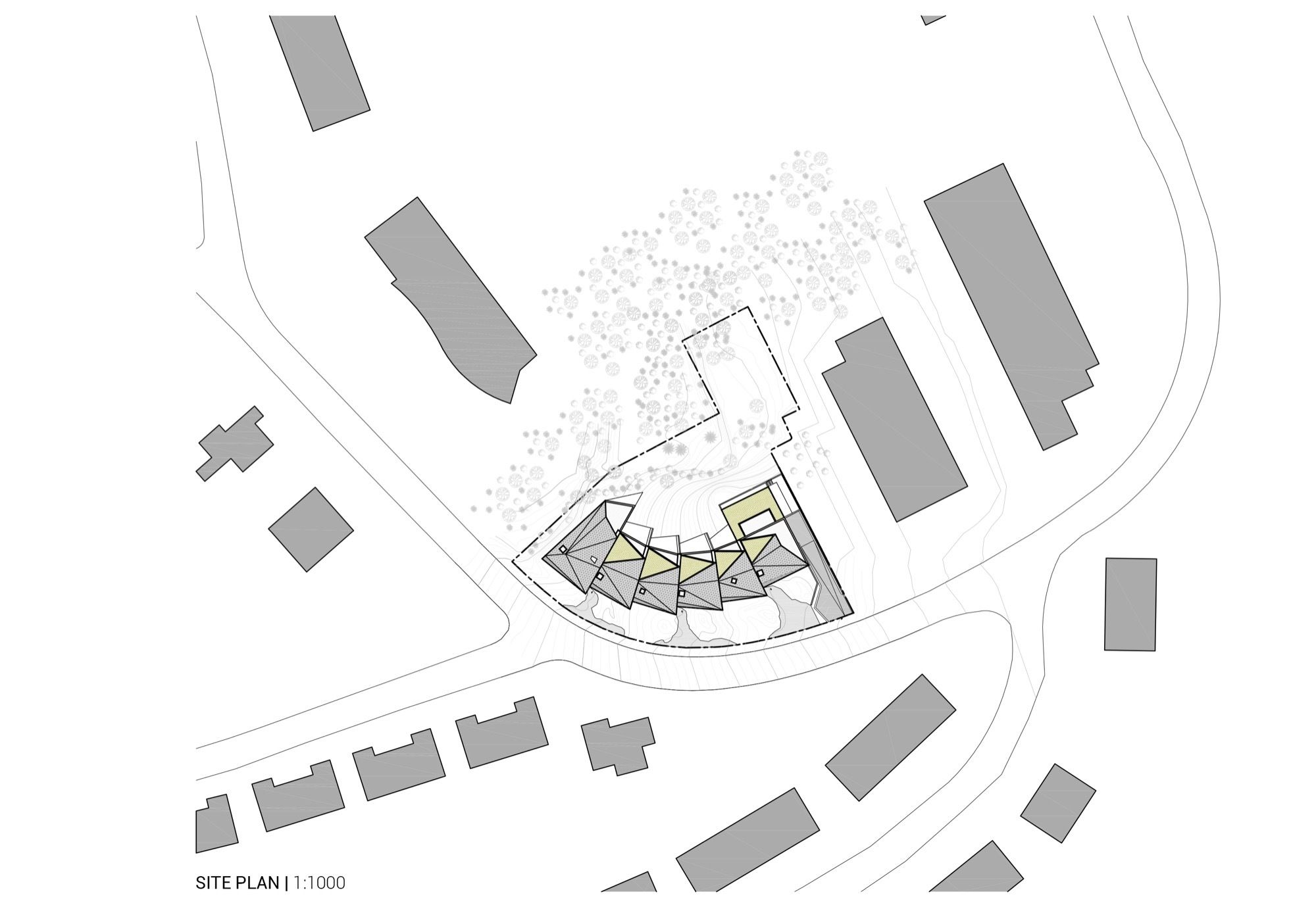Curved street, very steep topography and three-century-old trees – all conditioned the initial shape. Due to a specific context (small-scaled housing units on one side and large-scale apartment block on the other) splitting the main volume into six vertically shifted blocks adjusts the building to its surroundings. The density is preserved, and so is the feeling of belonging, identity, human scale. By splitting and shifting, volumes now allow for the natural light, open the panoramic views towards the landscape and create the visual contact with the sky.