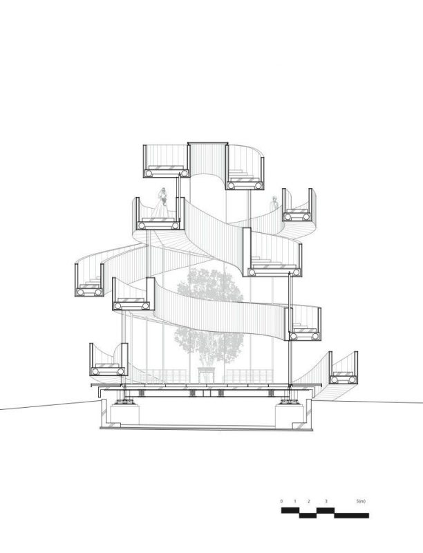 The inner spiral is connected to the intermediate solid steel posts, bearing the vertical loads, while the exterior spiral is coupled as an overhang. The materials were chosen to lighten the structure, working around its tensions and vibrations, or withstanding weather conditions – zinc alloy and wood panels, a pendulum-type base isolation device for light buildings, or glass panels held with dot point glazing (DPG) arms, moving freely during torque produced by horizontal forces.