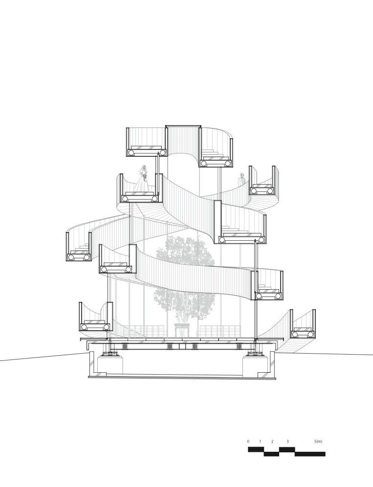 The wedding chapel design by studio Hiroshi Nakamura & NAP Co in 2013 is more than a space of communion. It is an architectural metaphor for the union of two souls under Heaven’s watch – two entangled spirals meeting at the top overlooking the Inland Sea of Japan, representing the individual paths of the bride and groom coming together as one.