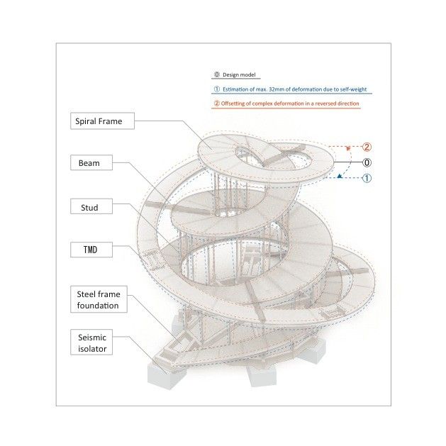 The structural system was developed in collaboration with Ikuhide Shibata of Arup. The mutually supporting spirals form a stable structure, restraining horizontal and vertical vibrations, working as a three dimensional hoop.