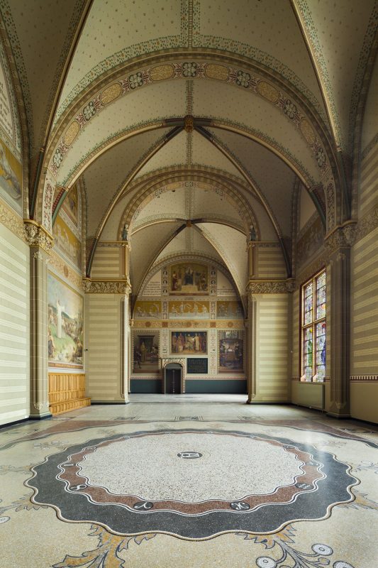 In keeping with the plan to restore the building where possible, the original monumental ornaments that decorated the walls and ceilings will be returned to the Gallery of Honour, the Grand Hall, the Night Watch Gallery and the stairwells. Cuypers‘ hallmark is best preserved in the library where the original design and ornaments have largely been maintained. The French interior architect Jean-Michel Wilmotte, whose work for the Louvre has earned him international acclaim, was invited to devise the interior design for the transformed Rijksmuseum. He has created all display elements for the galleries that complement the restored 19th century museum, including the display cases, plinths, lighting and furniture. In consultation with Cruz y Ortiz, Wilmotte has also determined the interior colour scheme, which has been inspired by Pierre Cuypers’ palette for the building.