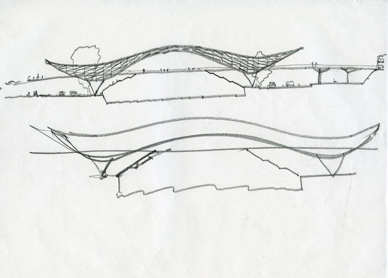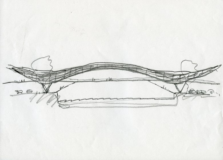 The bridge is made primarily out of glass and steel. The roof is supported by a space frame type structure, that is self-supporting, along with supporting the roof glass, spanning a distance of 150 meters.