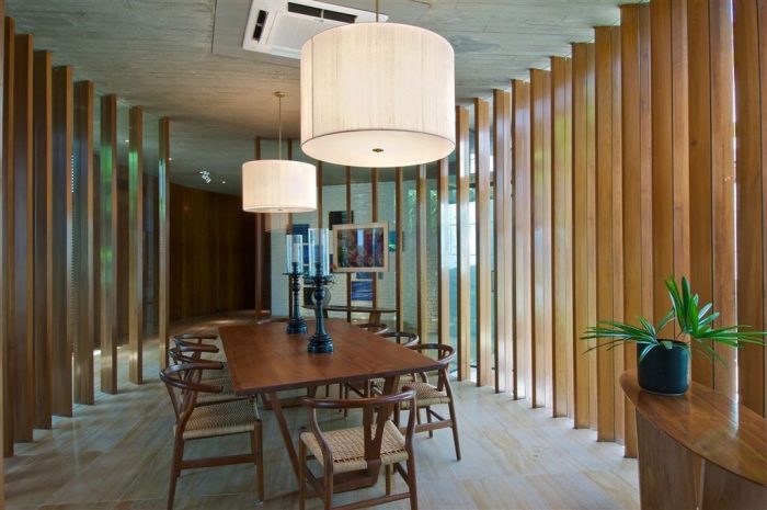 Only on stepping inside through the teak wood doors does one comprehend the expansive river views. The large entrance space, along with the deck outside, functions as an informal lounging zone. It also encloses an elliptical, glass and teak framed dining enclosure. Crossing over a bridge from here, one passes through an internal court before descending into the lowered living room.