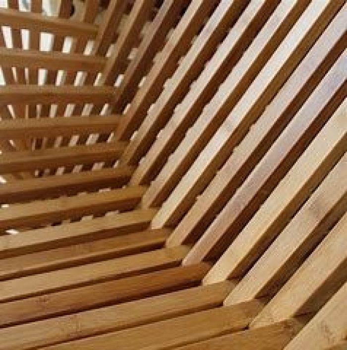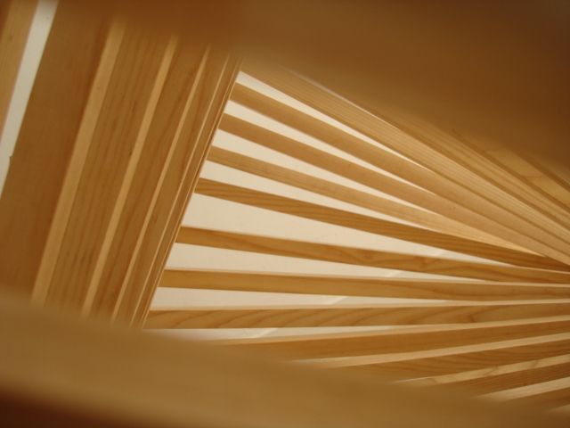 The foundation of any chair is the flat surface you’ll eventually sit down on. Using this notion as a starting point, I made several cuts in the flat surface and pulled up the different beam-like strands of cut surface. This created the preliminary but already distinct features of any chair: back, seat and legs. The rhythm of the wooden beams gives the chair an organic shape. The cuts are most visible when the chair is still down. But at that stage of the construction, I still didn’t know what shape the chair would take in the end. This was determined by the various arches of the wooden beams the chair is made of. Folding the chair into its definitive form, as a creator, I felt a special connection to the material I was working with.