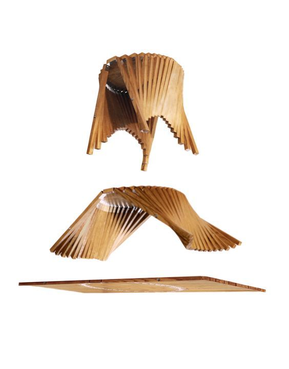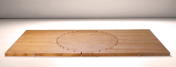 A strategically placed pinning bolt runs laterally through the newly created legs, which are attached to the circle- now tabletop- with flexible straps. When the circle is lifted, gravity acts upon the legs which bend from the straps as well as rotate around the common pin. When the table is ‘fully’ lifted, when the legs are at rest with gravity, if it is set down, the legs form a sturdy, stable latticework that yet appears to be in mid-flux. Really great. Ingeneous.
