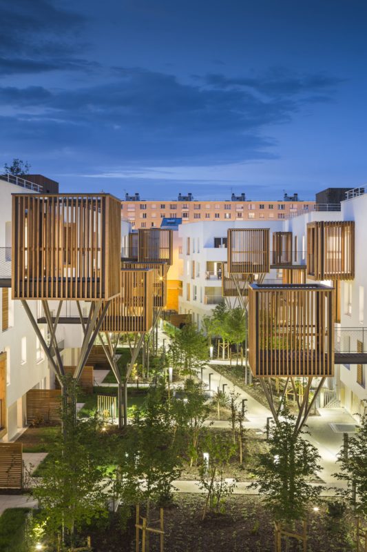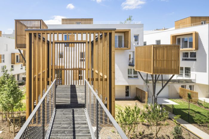 Greenery also has an important role to play, slipping into the building’s interstices and colonizing the interior courtyards of the city block. This domestic, vernacular aspect underscores the architectural plan through the treatment of the terraces, which are detached from the façades, served by wooden footbridges and can be imagined as treehouses.
