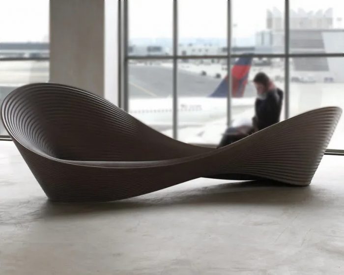 This sculptural bench is one continues piece in which seat and back seamlessly melt into one another.