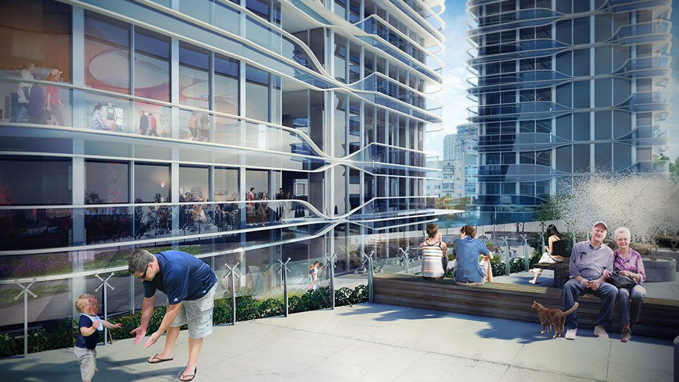 As with greenery, water features interact with visitors but in a different and more playful fashion. With the aid of artificial intelligence, fountains change their “mode” according to the positions of people; for example in “God mode” water makes way for a walking person and gradually rises as the distance increases. The tallest tower is, additionally, surrounded by a smart interactive curve in the ground which changes light intensity and color based on the number of people and their activity level.