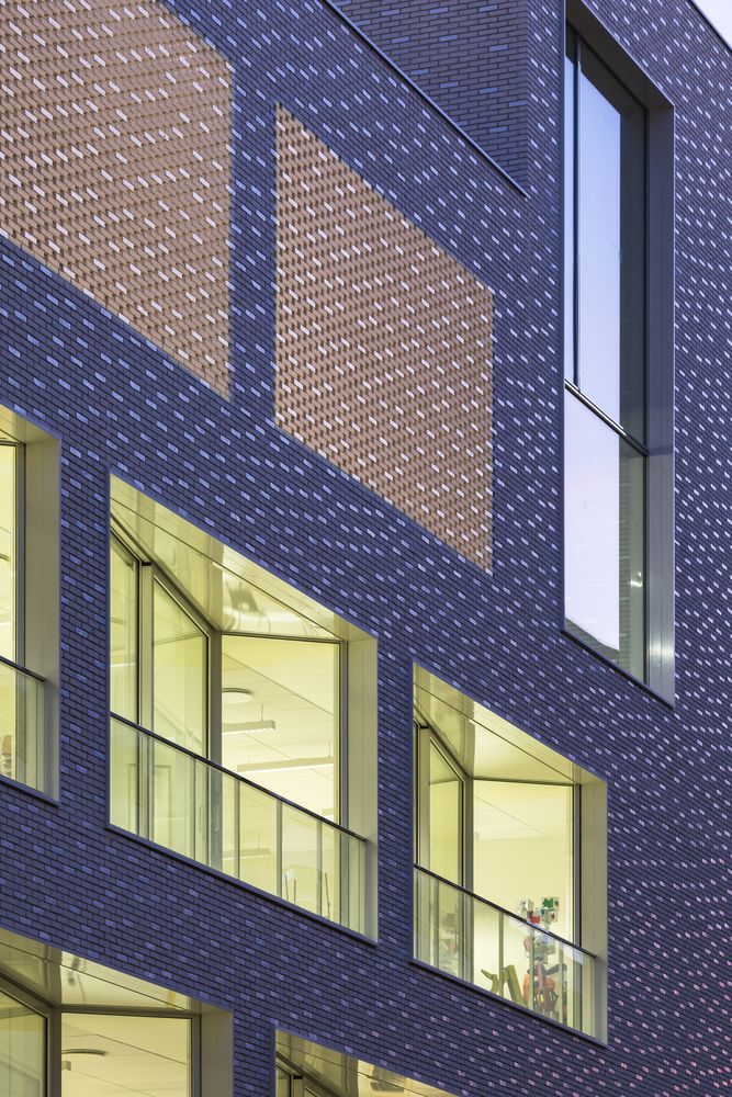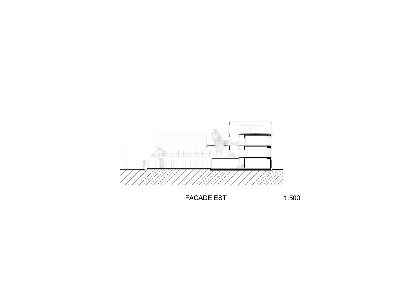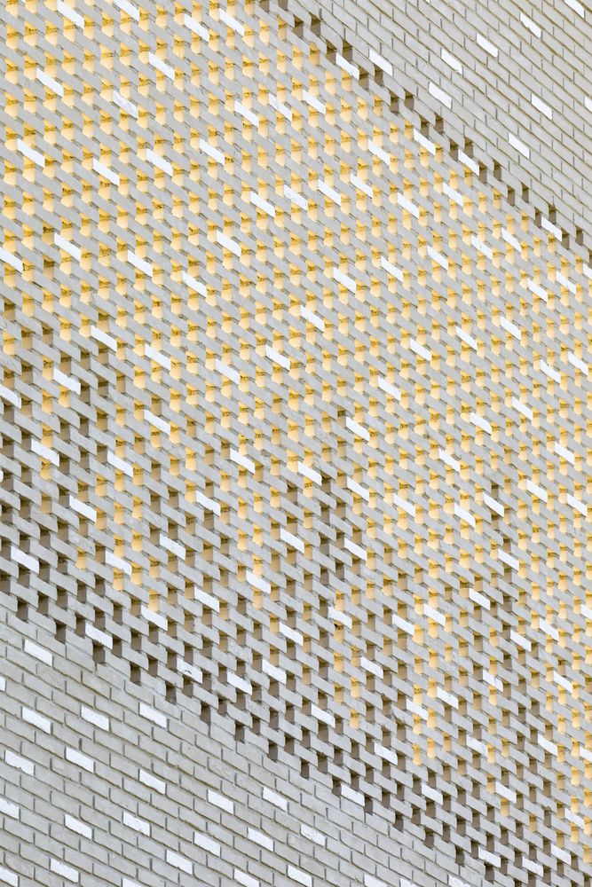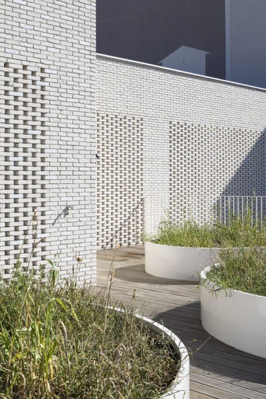 Street side, the building is a unitary volume, built-in sculptured white brick on three levels. The brick façade extends to the level of the courtyards of the uppermost levels, integrating them in a continuous volume. A terra-cotta mashrabiya creates kinetic and playful shadows while filtering the sun from the south.