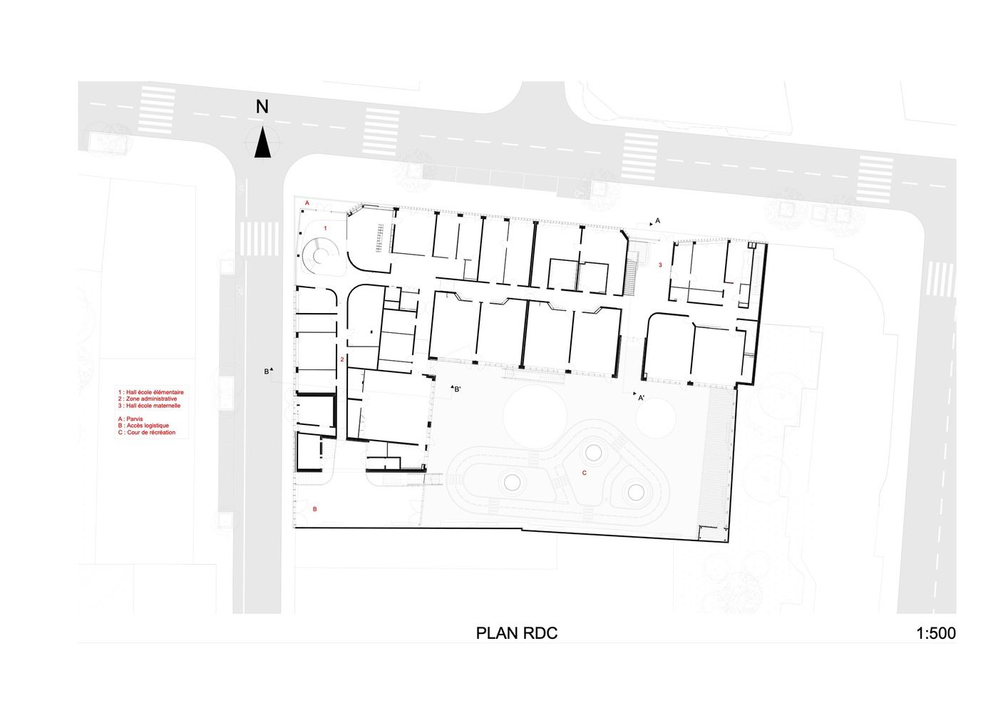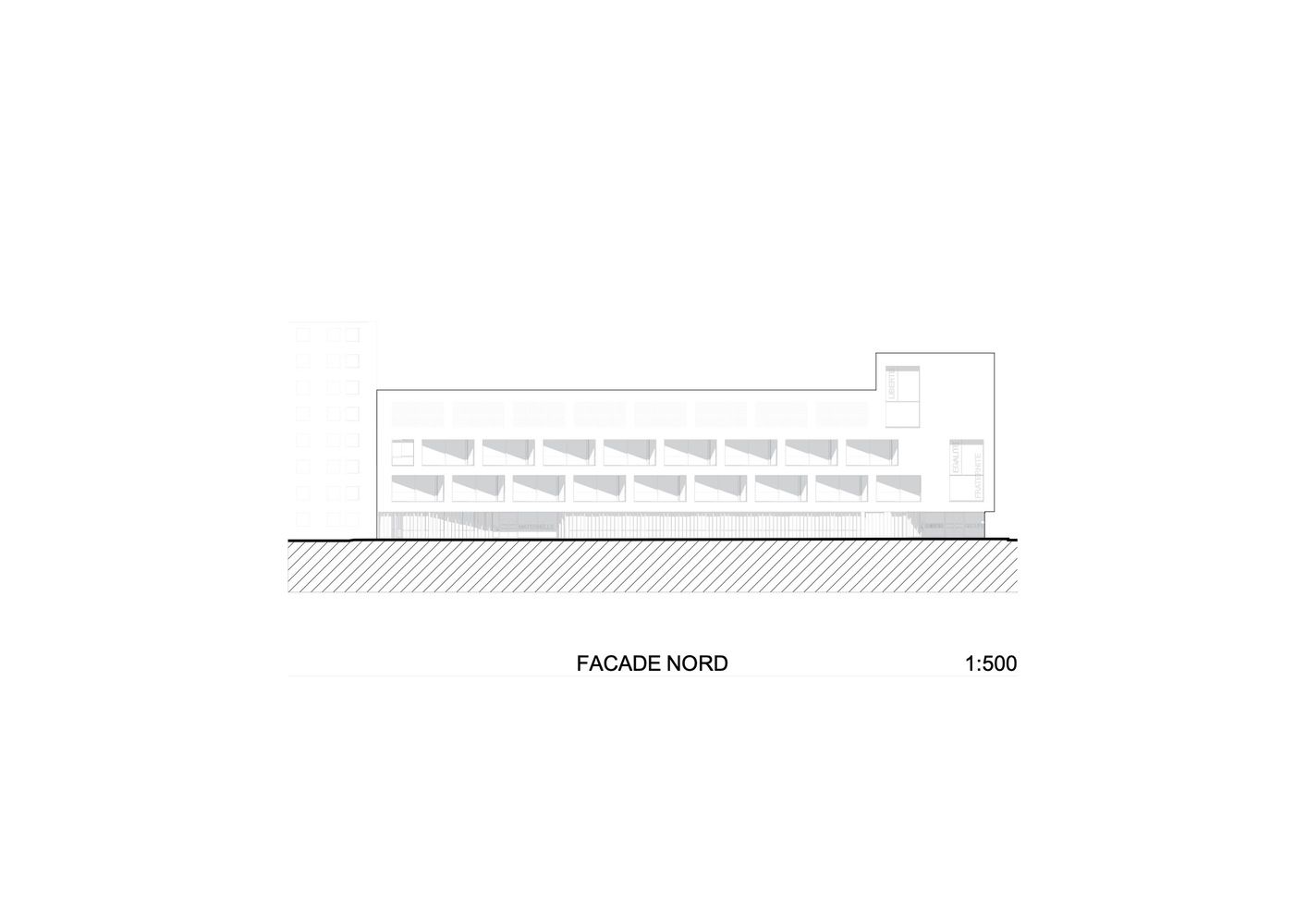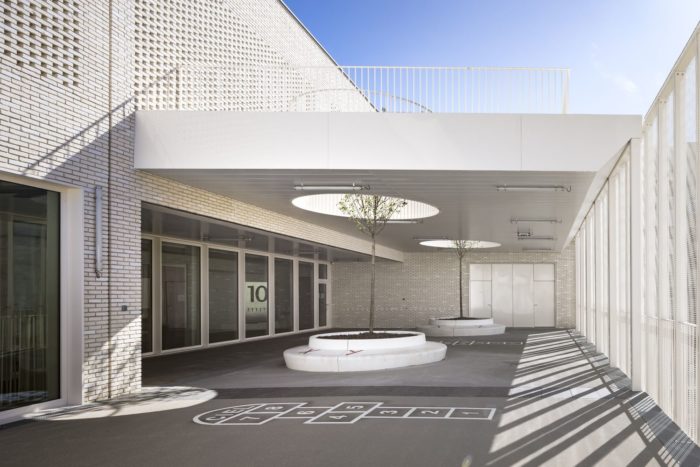 The building is placed at the edge of its lot and is laid out in an L shape. Adjacent to the existing building to the east, it creates the link to the future ZAC to the west. The school’s northwest corner is treated as a signal, the pivot of interlocking programs, it establishes a relationship on a balanced scale with future buildings on neighboring lots.