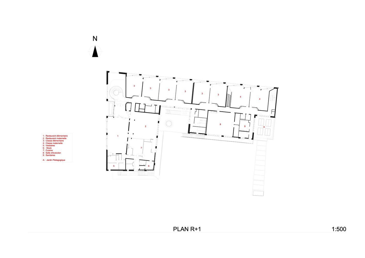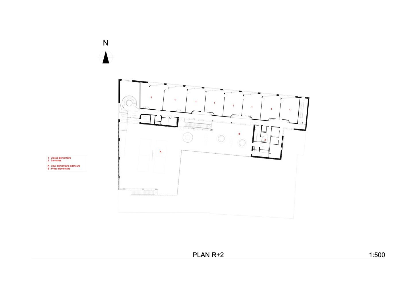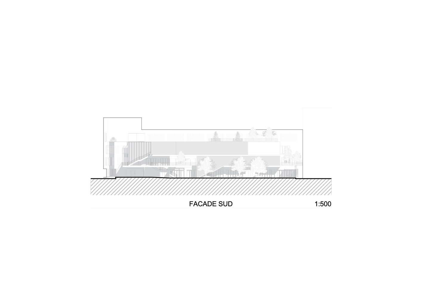 The building is placed at the edge of its lot and is laid out in an L shape. Adjacent to the existing building to the east, it creates the link to the future ZAC to the west. The school’s northwest corner is treated as a signal, the pivot of interlocking programs, it establishes a relationship on a balanced scale with future buildings on neighboring lots.