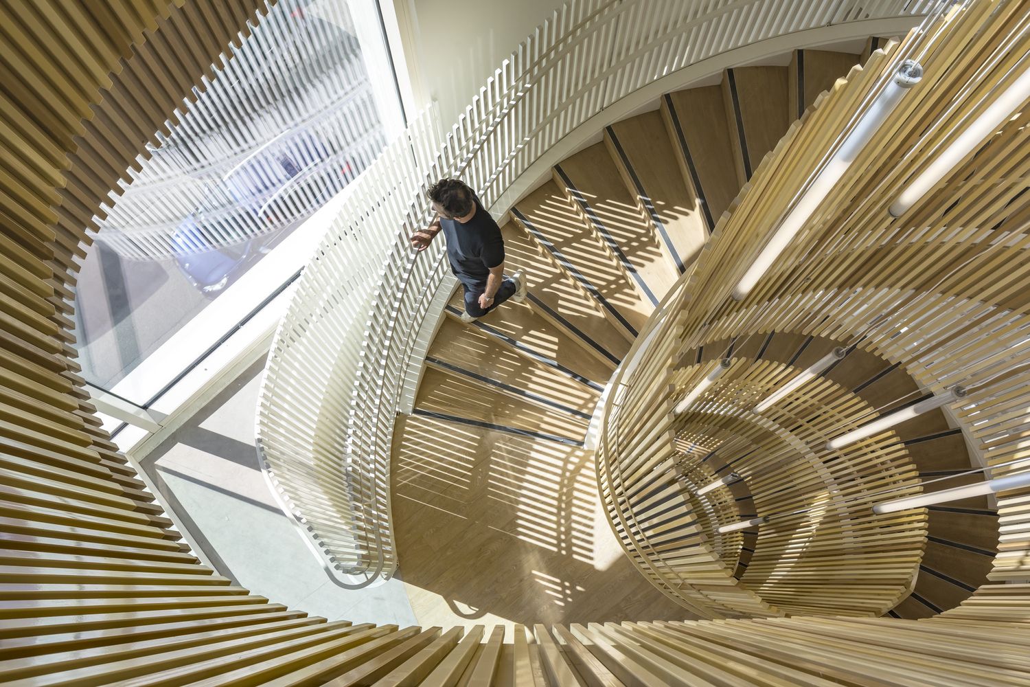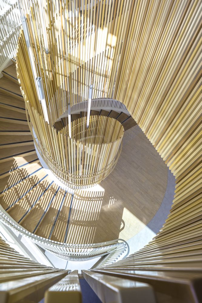 The building’s height, from north to south, creates a soaring figure at the northwest angle, a stepped volume echoing skyscrapers, and ensures optimum sunlight.