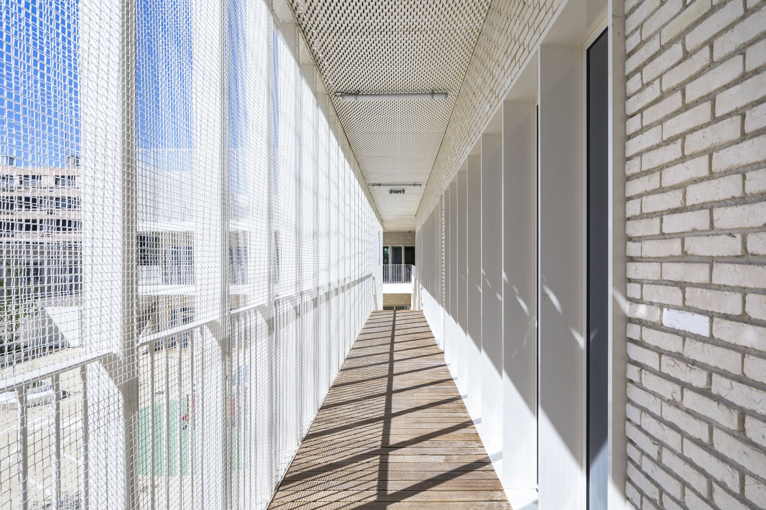 The courtyard and play area on level two extend the interplay of solids and voids into the heart of the city block. The different material qualities of the building, whether mat or varnished brick, locks, or aluminum carpentry, are in a range of white tones, all varied ways to catch and reflect light, giving the appearance of a single white and evanescent volume. In addition, landscaped teaching gardens are placed on the second and fourth levels.