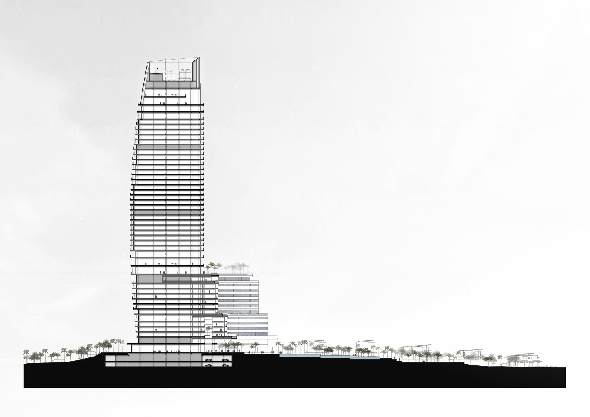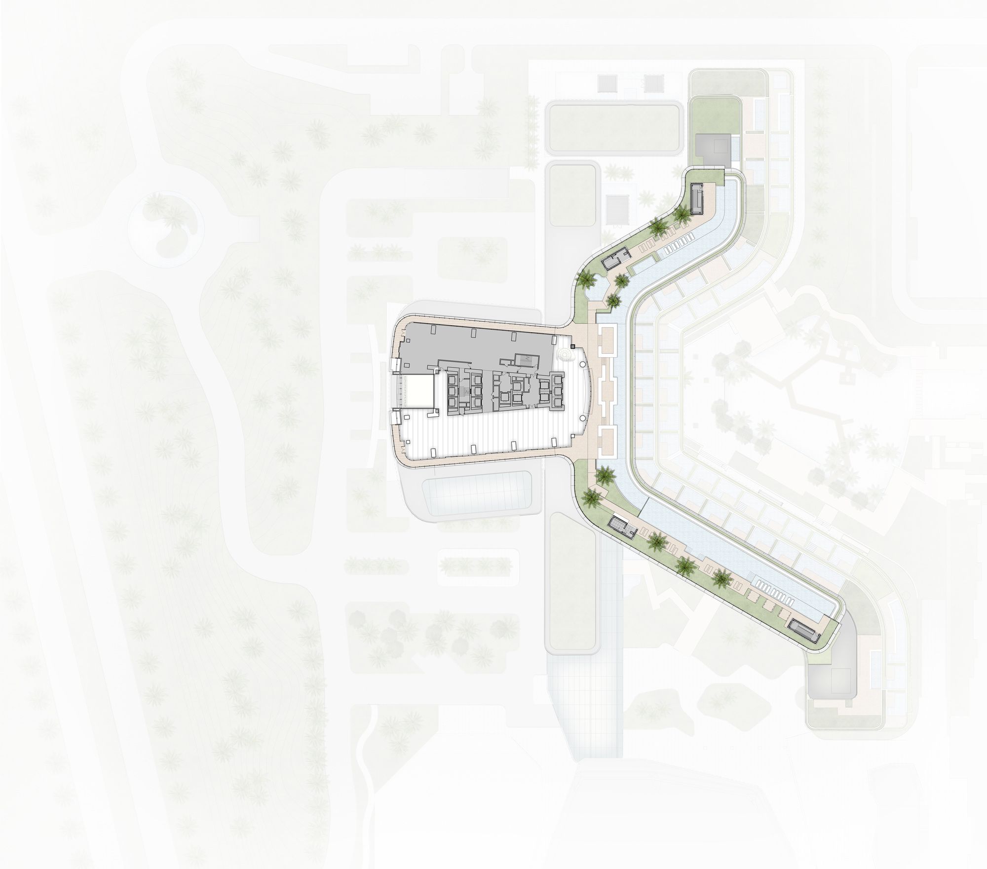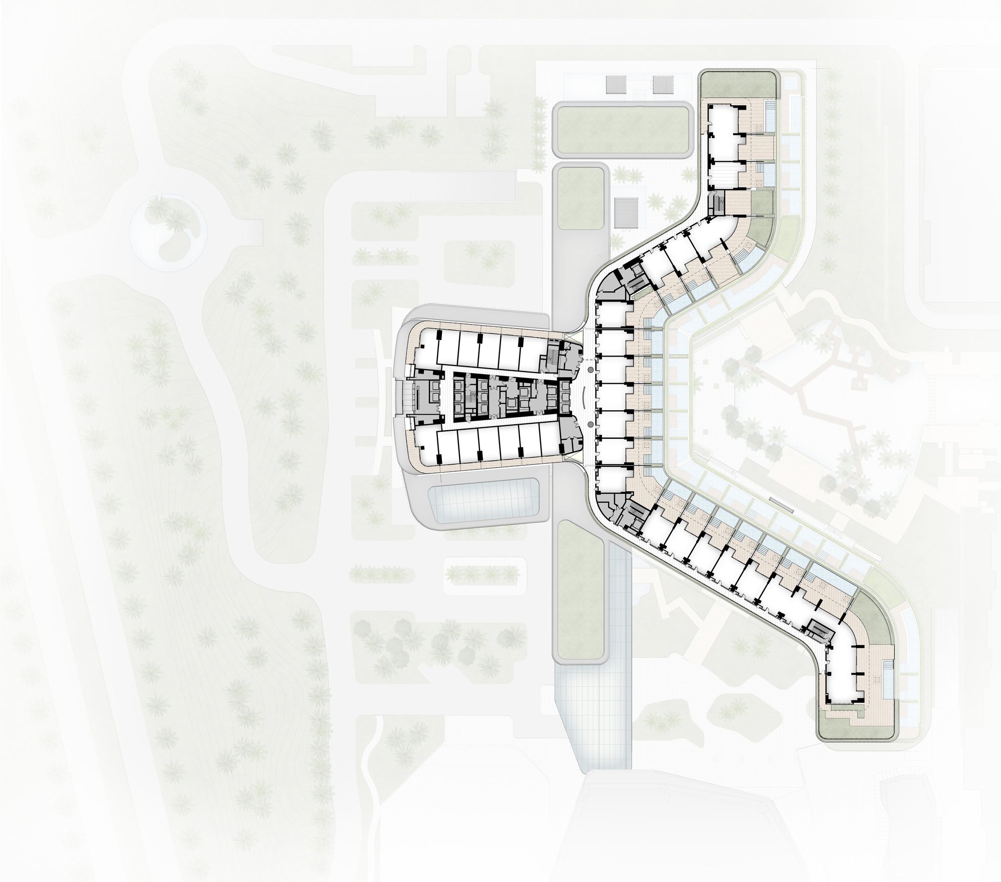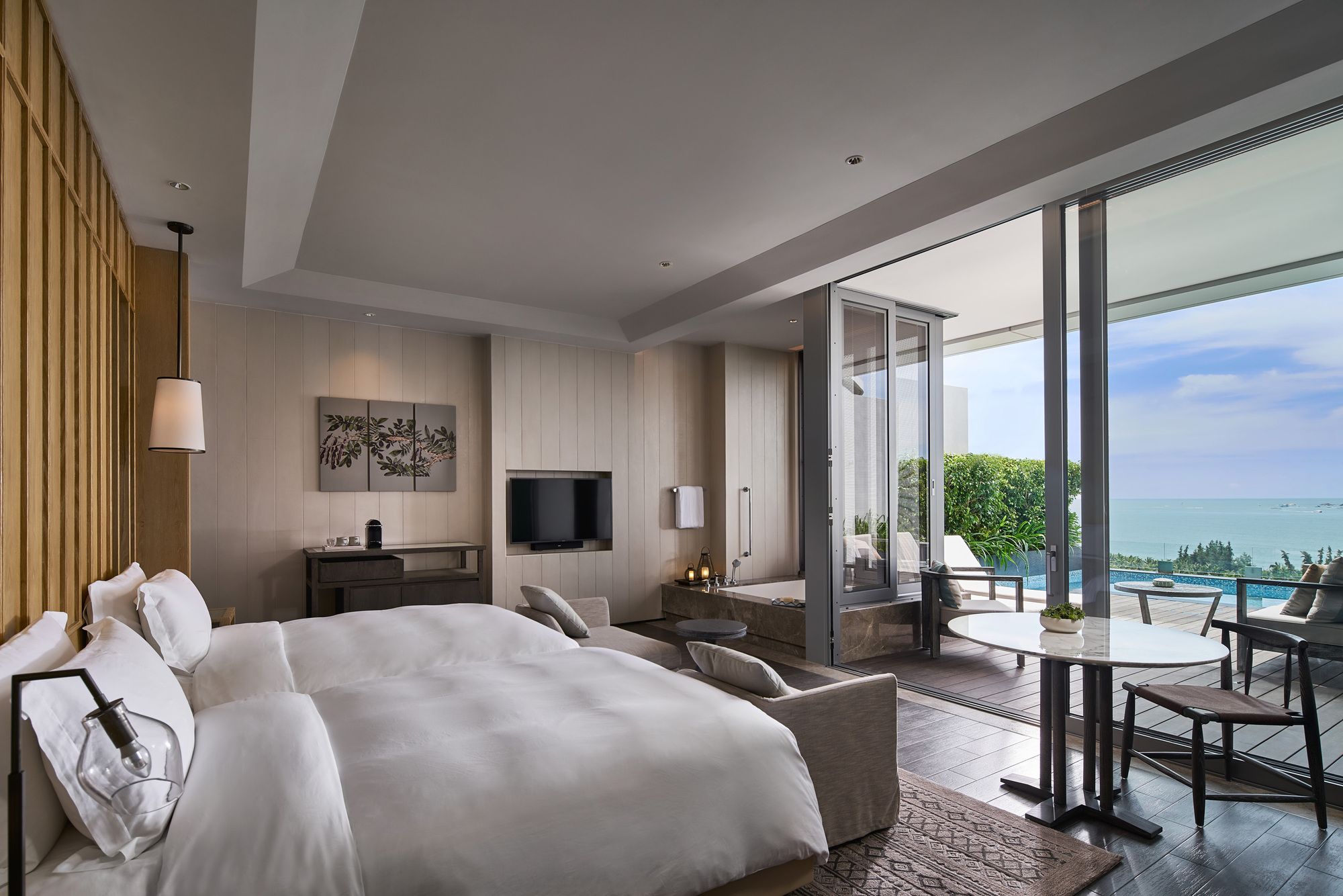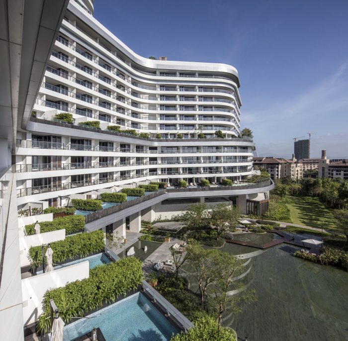 The amenity-rich resort is purposely designed to be intimate and exclusive, offering a limited 246 generously sized rooms—all with ocean views and individual terraces, some with their own plunge pool. The 465 serviced apartments are located in the main tower, which sits immediately behind the low, linear bar of hotel rooms. The top of the tower features a multilevel club for the exclusive use of the apartment residents and culminates in the iconic “lighthouse beacon.” The Sanya Forum is designed as a premier convention facility, catering to national and international economic and political summits, as well as a variety of other meetings and special events.