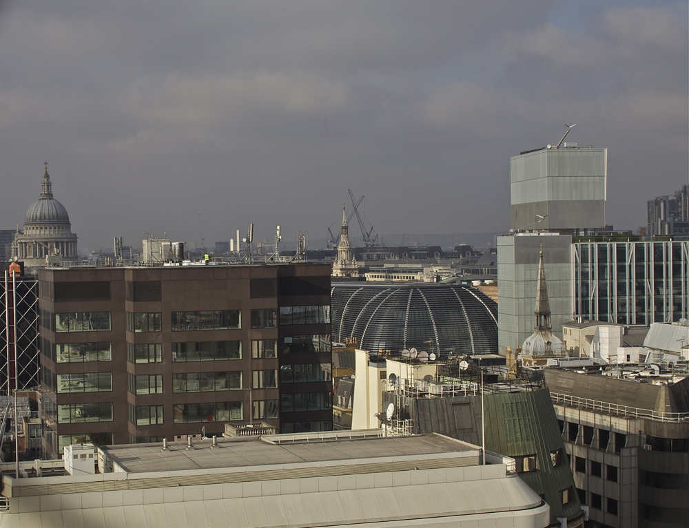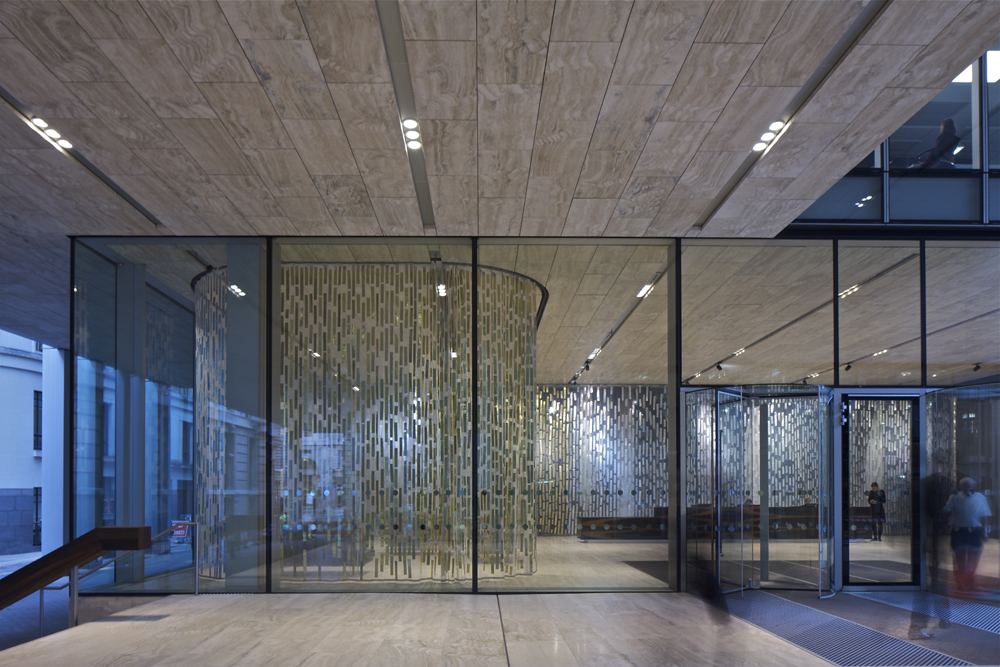 The central cube has a distinctive repeated pattern of structural steel columns embedded in the façade. At street level, the entire cube is lifted to create generous pedestrian access to the tall glass lobby and a covered forecourt that opens a visual passage to St. Stephen Walbrook and its churchyard – creating a surprising moment of transparency in the otherwise constrained opacity of the medieval streetscape.