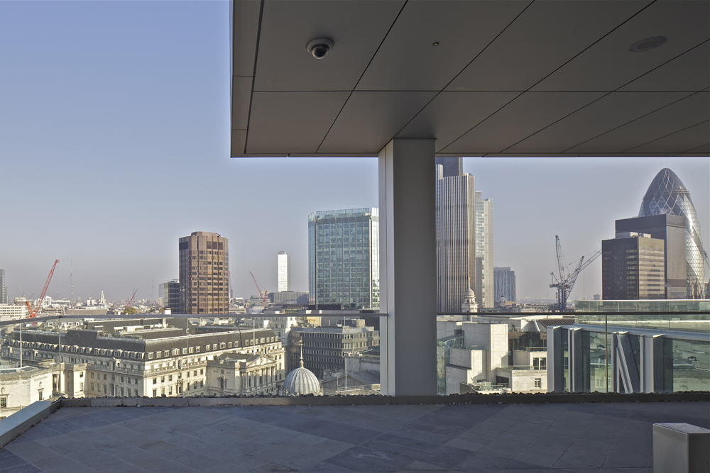 New Court comprises a central cube of ten efficient and flexible open-plan office floors, which facilitate views over St. Stephen’s and the surrounding City. This cube is linked to four adjoining annexes, with meeting rooms, enclosed offices, vertical circulation, reception areas, and a staff cafe and gym. The top of this central cube features a landscaped roof garden with outdoor meeting areas. This, in turn, is overlooked by a Sky Pavilion – a small tower with three double-height stories peering out over the city – which houses meeting and dining rooms and a multifunctional panorama room with extraordinary and unfamiliar views across the City, including St. Paul Cathedral.
