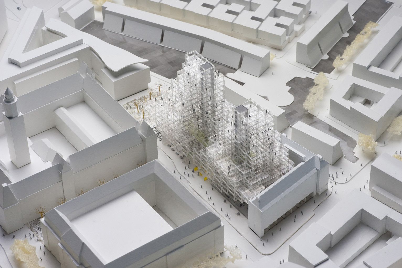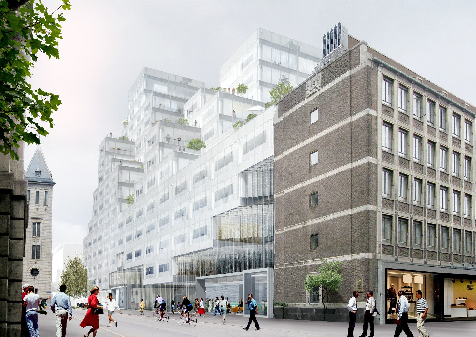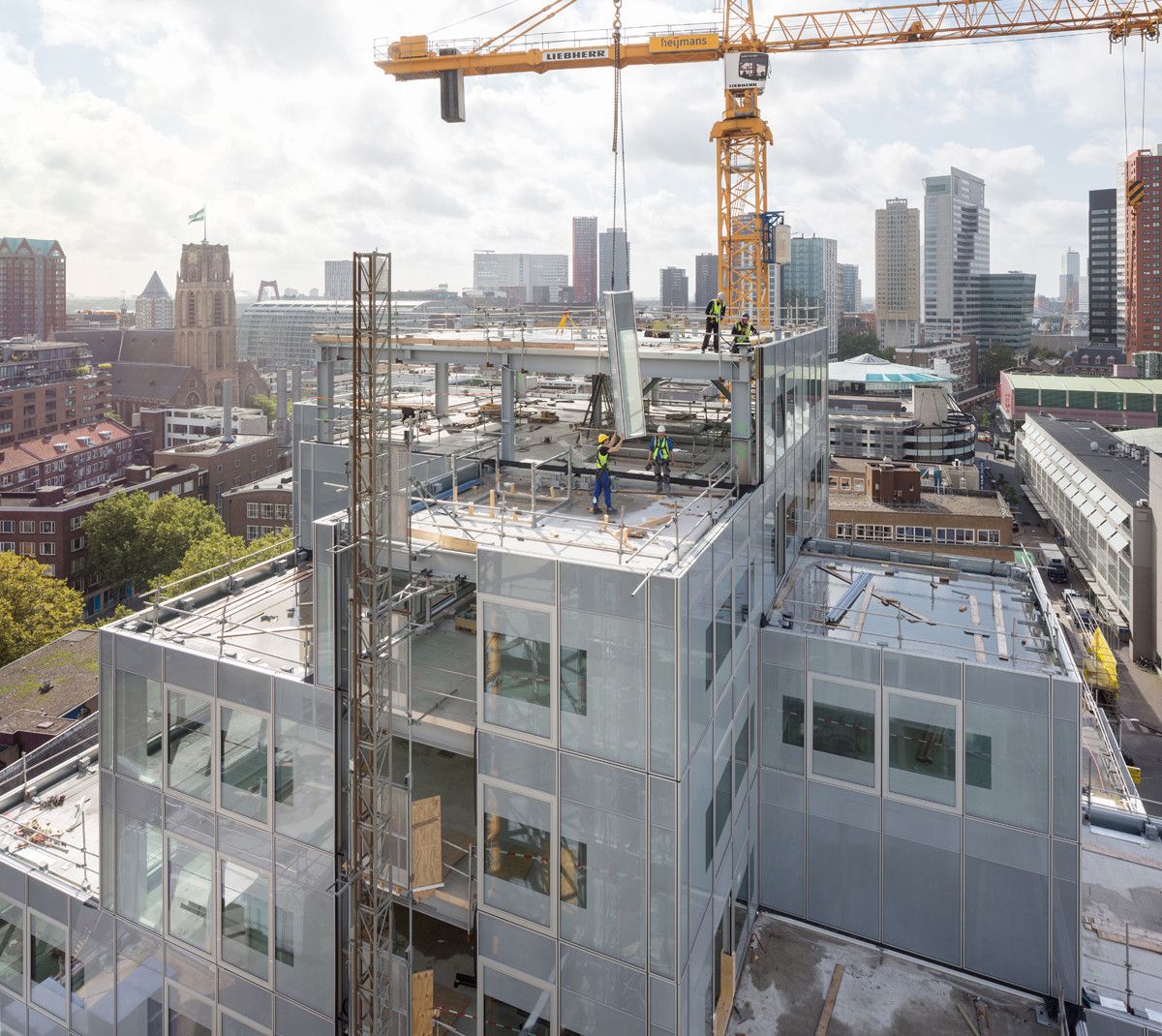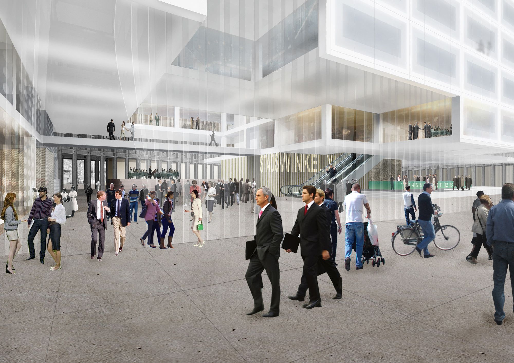 Rem Koolhaas states, “what is now needed may be subtlety and ambiguity in the midst of an overdose of form. We propose a ‘formless’ heap, consisting of smaller elements that are shaped to perform a number of major and minor responsibilities. Where necessary, the shape can be formal and impressive, almost symmetrical – for instance, from the Coolsingel, glimpsed between the two survivors – and where desired, it can be delicate and accommodating – for instance in its relationship with the existing monument, Stadstimmerhuis“.The design, led by OMA partners Reinier de Graaf and Rem Koolhaas, was chosen from five submissions by Dutch architecture companies following a public consultation period and the deliberation of an expert jury, which commented: “OMA’s design was the perfect combination of innovation and suitability for the surrounding context“.