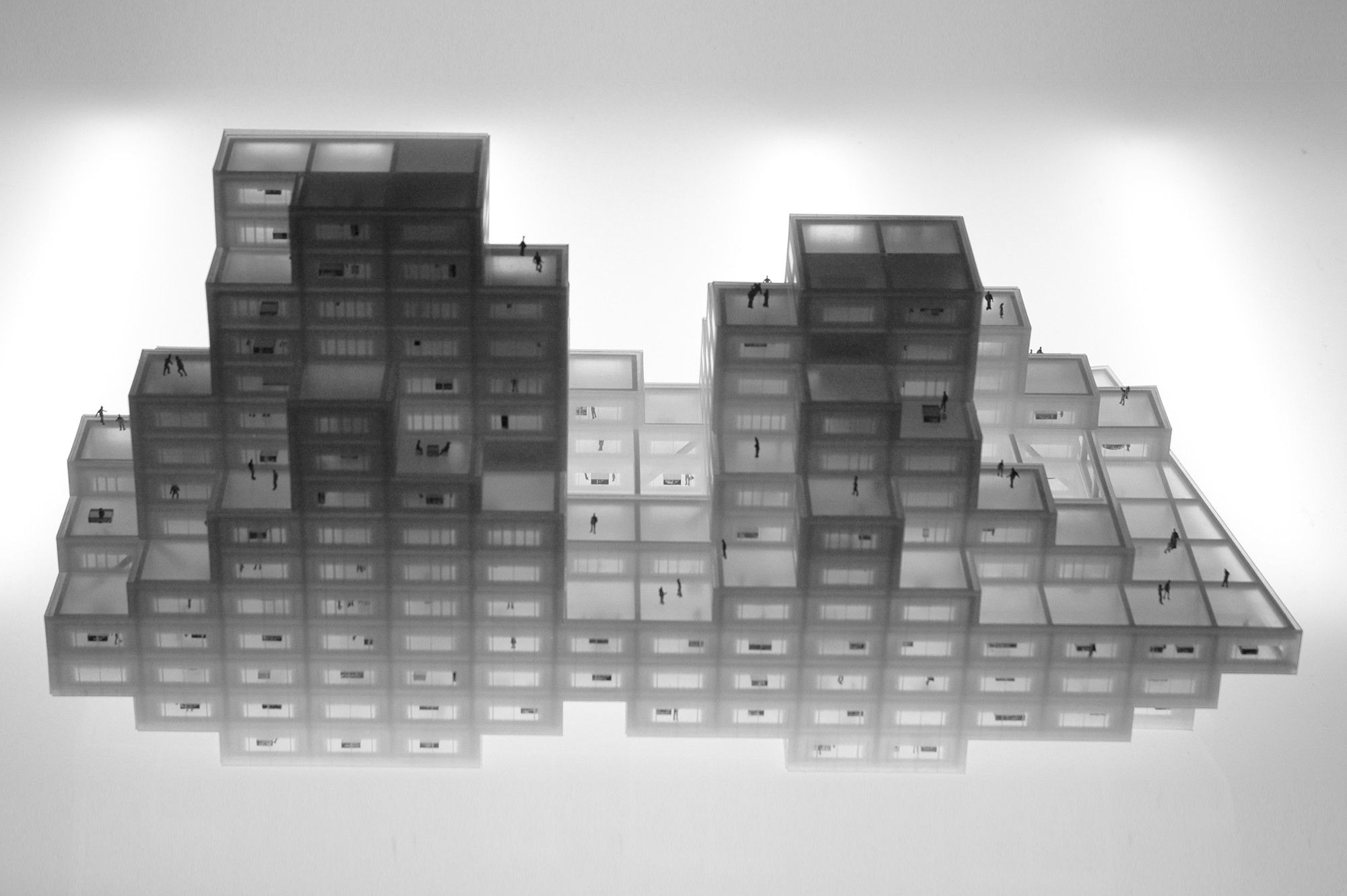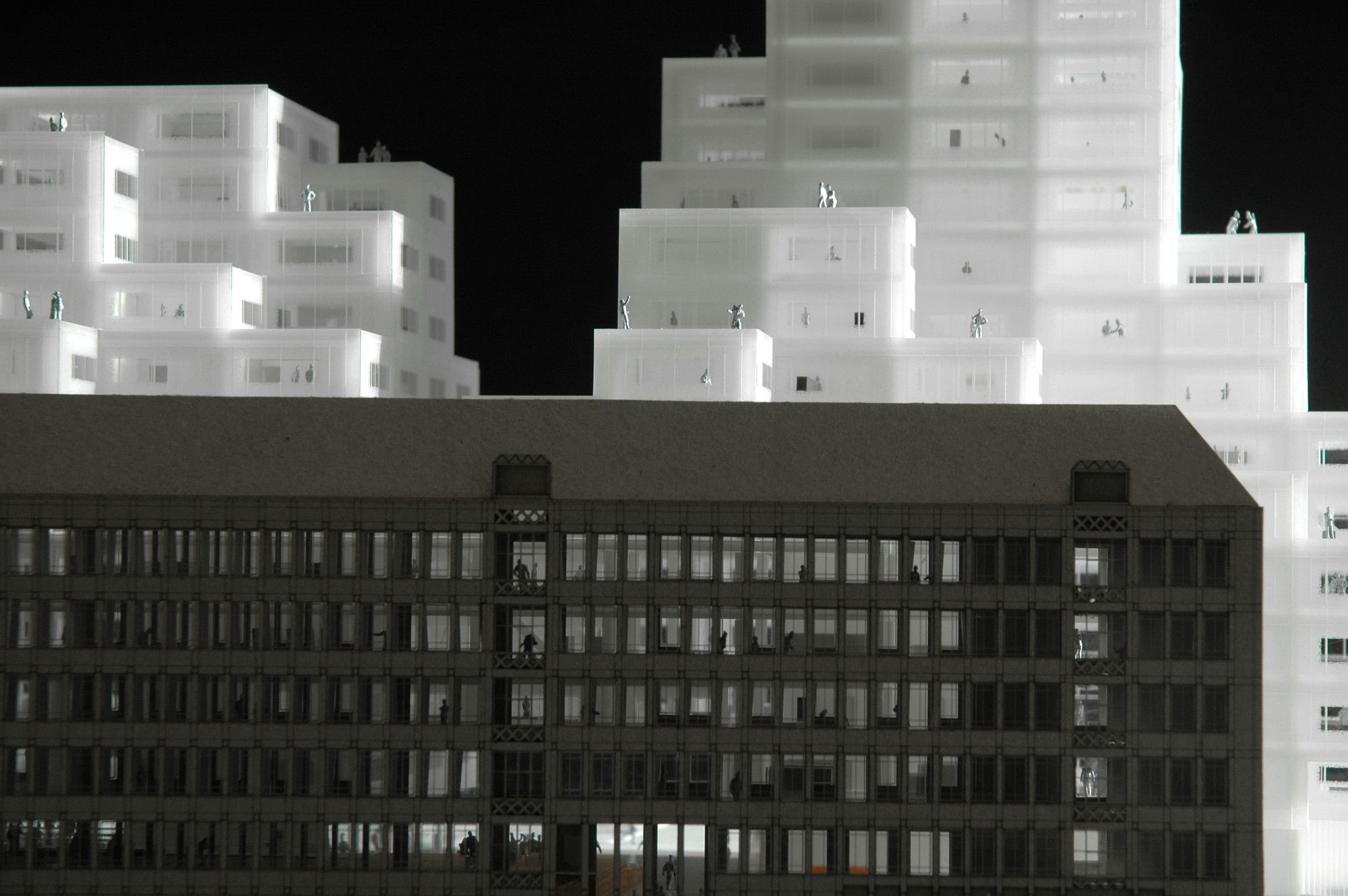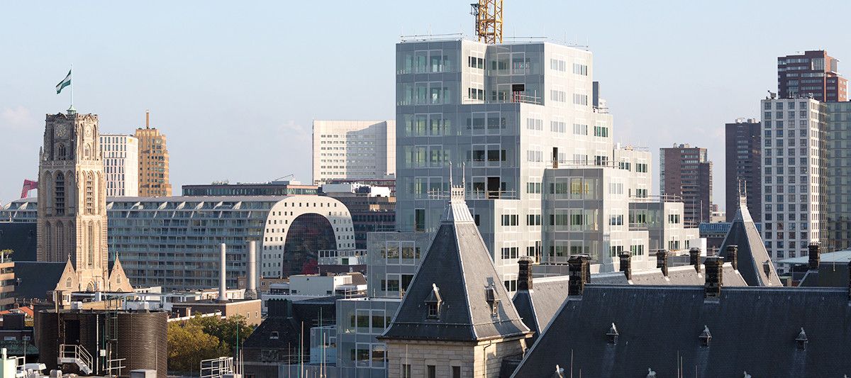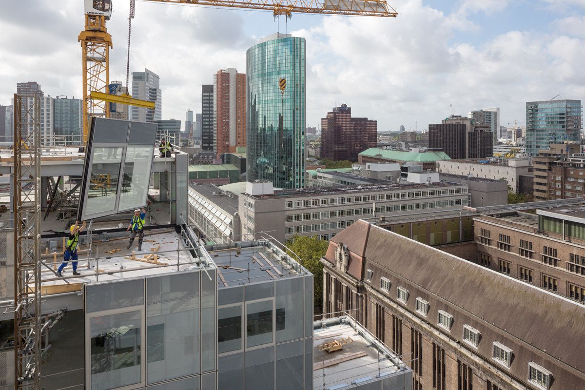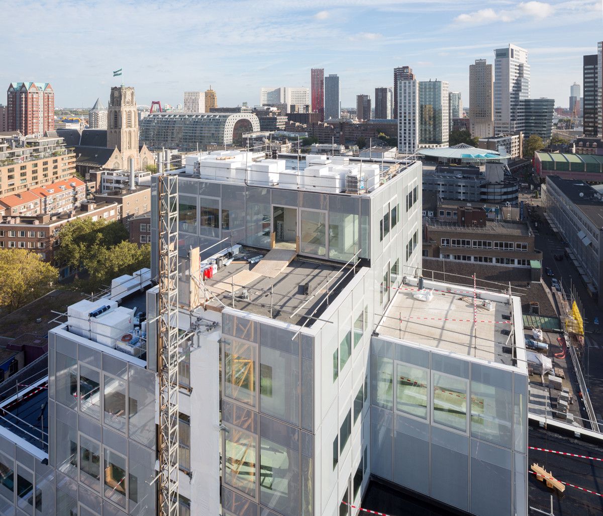 The Stadskantoor’s innovative structural system generates maximum efficiency and versatility both in construction and in program: units can be added or even dismounted from the structure as demands on the building change over time, and can adapt to either office space or residential parameters as desired. Green terraces on higher levels provide the possibility of an apartment with a garden in the heart of urban Rotterdam. The project is required to be the most sustainable building in the Netherlands. Two large atriums connected to a climate system work towards achieving this goal. Functioning as the building’s lungs, the atrium climate system stores warm air in summer and cold air in winter, releasing the energy as desired. Hi-tech translucent insulation in the glass facade allows for energy efficiency.