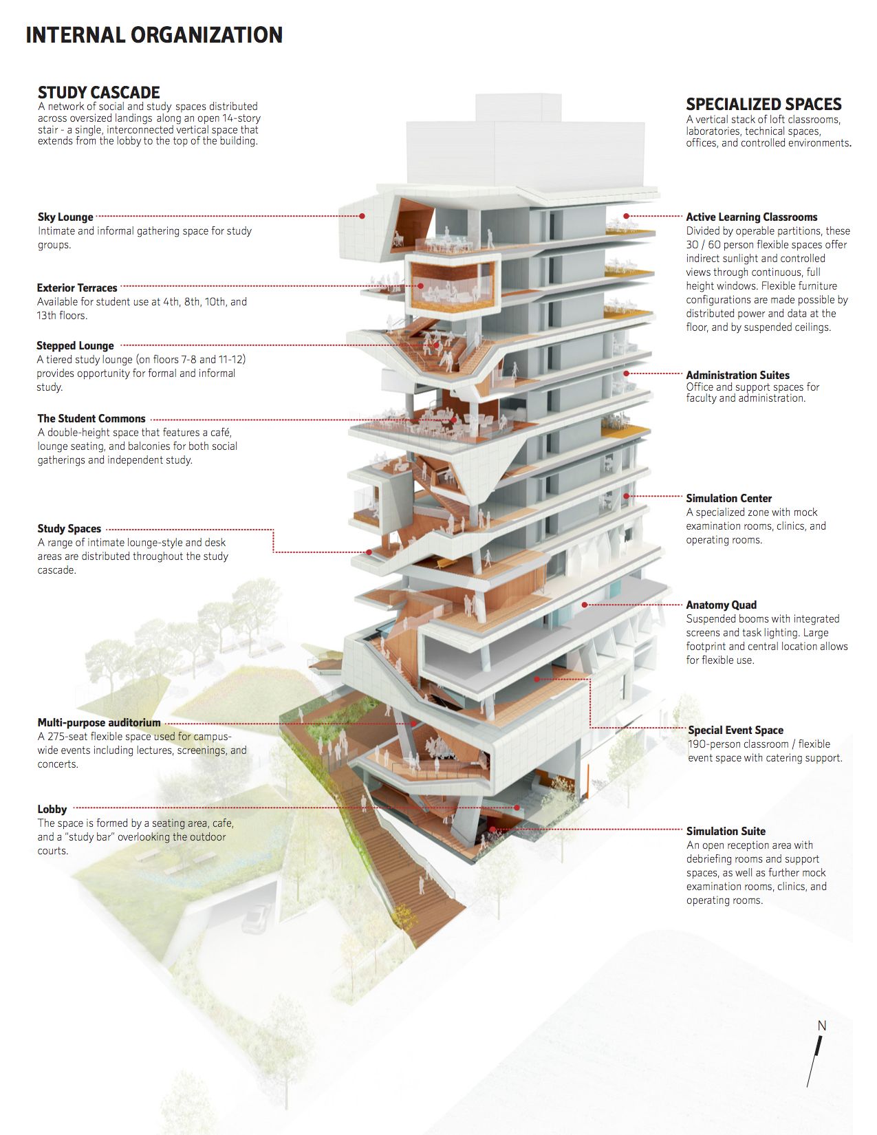 “Space matters for structured and informal learning,” said Elizabeth Diller, founding partner at Diller Scofidio + Renfro. “To support Columbia’s progressive medical education program, we designed a building that will nurture collaboration. Its defining feature is the Study Cascade–a 14-story network of vertically linked spaces in a variety of sizes, both focused and social, private and communal, indoors and out.”