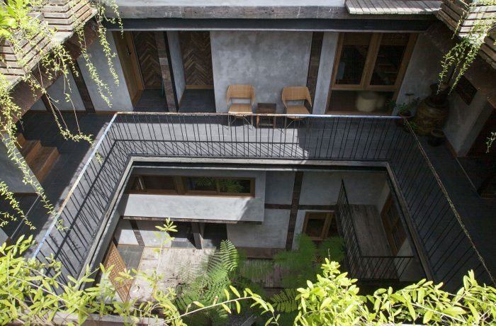 The aim of this concept is to make a contemplation space, an oasis to hear the natural sound such as the sound of flowing water, leaves, and the blowing of cold air. It can be enjoyed by apartment users through small windows designed facing the courtyard. The courtyard is designed to combine the water, stone, trees, and light elements. On the second floor, there is a communal swimming pool and rooftop garden to enjoy the sunrise, watch the stars or enjoy the prevailing breeze. Greenery cascades throughout Ruang Tekuni to amplify the tropical feel. The nature elements also expressed the use of selected wood materials in building and furniture inside to enhance the sense of calm and tropical feeling. Most of the material in this design using the reclaimed lumber and recycled roof which was carefully selected by the owner, Pitched terracotta-tile roofs are inspired by the traditional Balinese rice-barn roof shape and help to create more interior space.