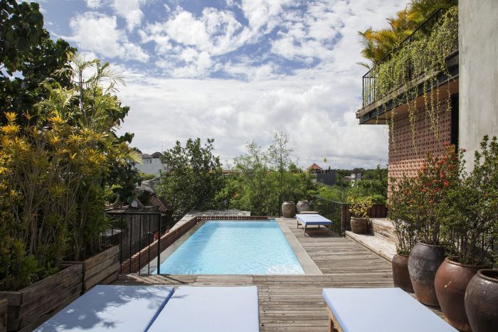 Ruang Tekuni, an oasis inside the urban peak of life. Ruang Tekuni is a boutique apartment located in Seminyak Bali. Exclusively for young expats, this boutique apartment consists of 12 studios across two levels, and a penthouse for the owner. On the ground floor, there is a lobby, administration room, also maintenance and service room. Balconies circulate around and look over a central courtyard filled with Brazilian fern trees and a pool with trickling water. Designed by DDAP Architect, an architect studio based in Ubud Bali, the concept is to bring tropical rain-forest on the apartment’s design. “We proposed the idea of a tropical rain-forest by placing green and zen elements in the center to create a sensory experience in terms of the visual and in the rustling of leaves in the trees and light breeze that blows on to the skin to present buildings that are in harmony with nature” says Dirgantara I Ketut, principal of DDAP Architect.
