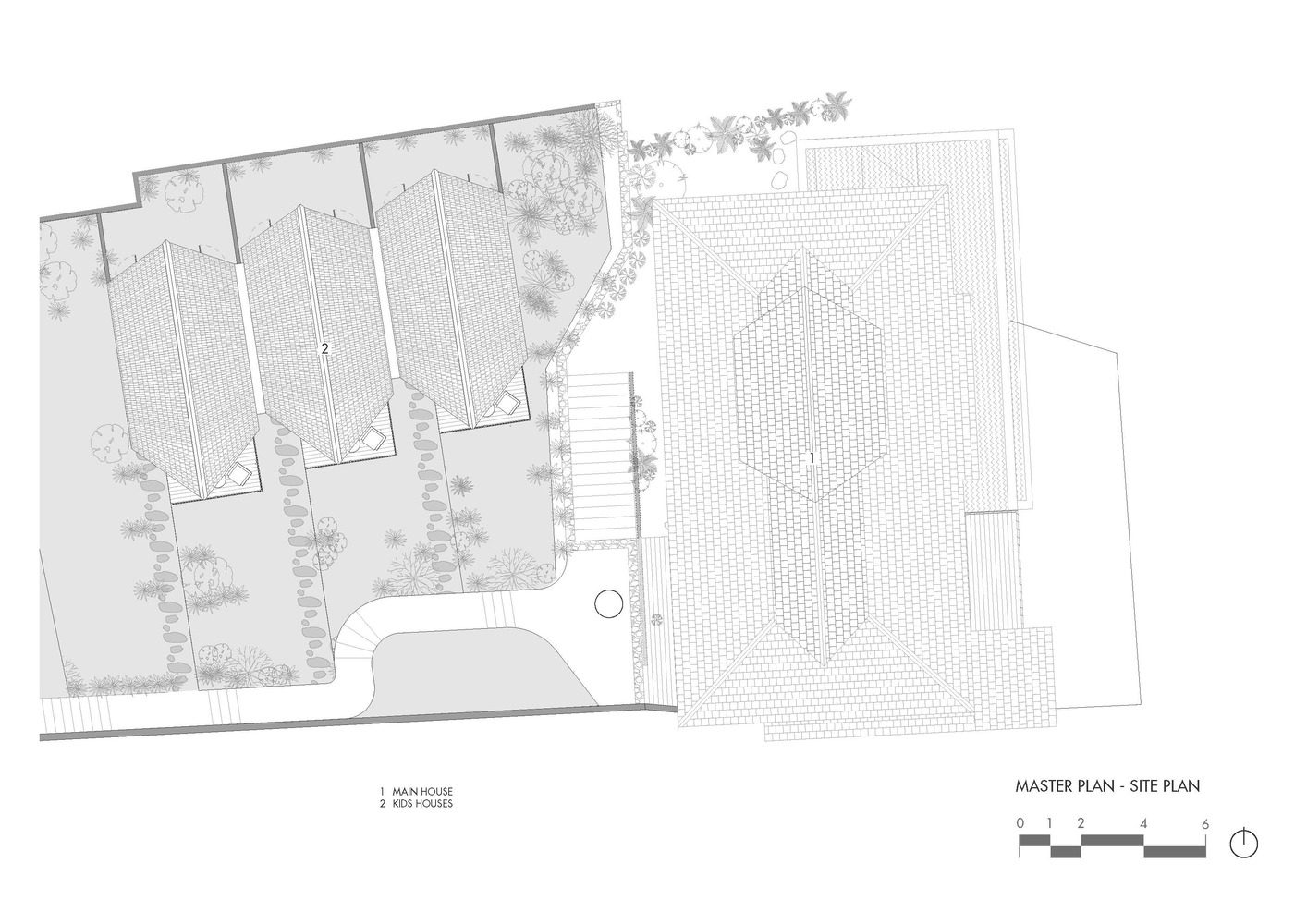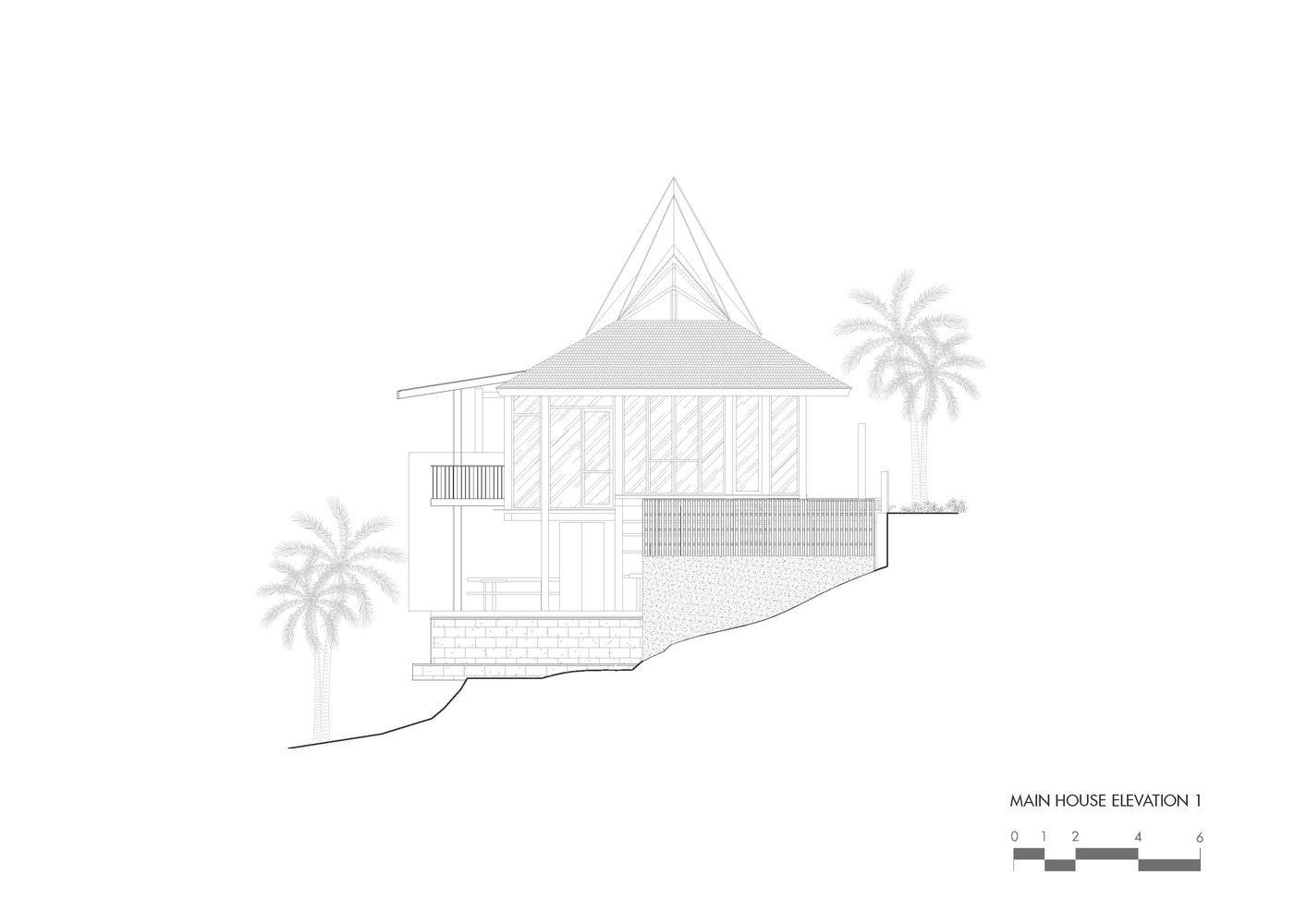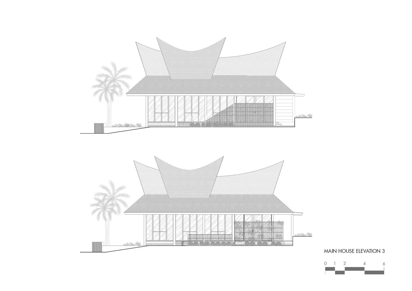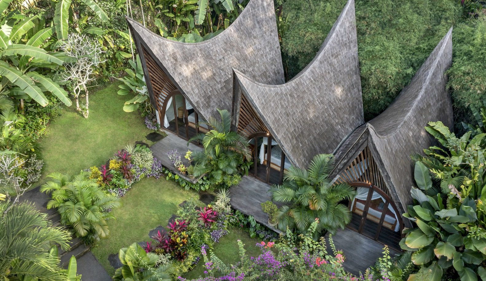 The ensemble includes a main house and three guest houses. Inspired by Sumatran architecture, the guest houses feature pointed roofs and arched windows that balance these dynamic forms. Strategic use of glass and wide overhangs help manage the indoor climate, protecting against rain and sun while maintaining natural light.