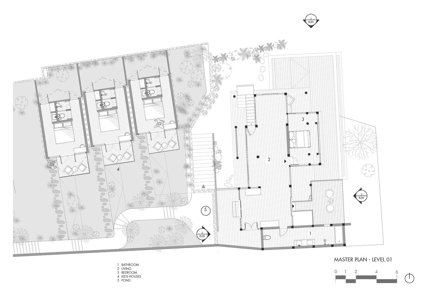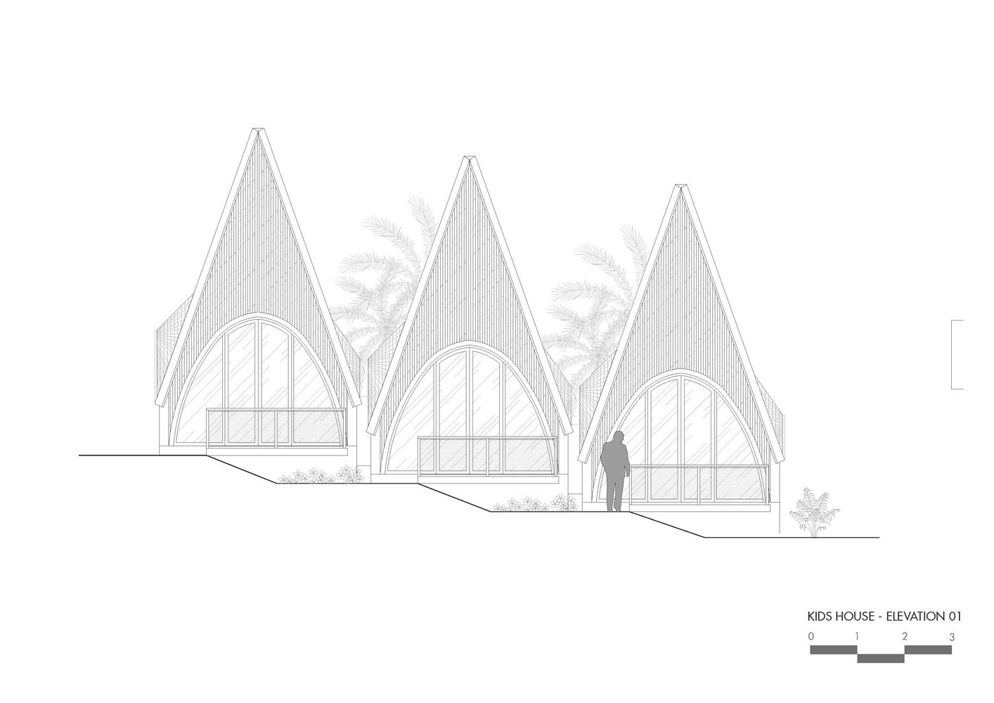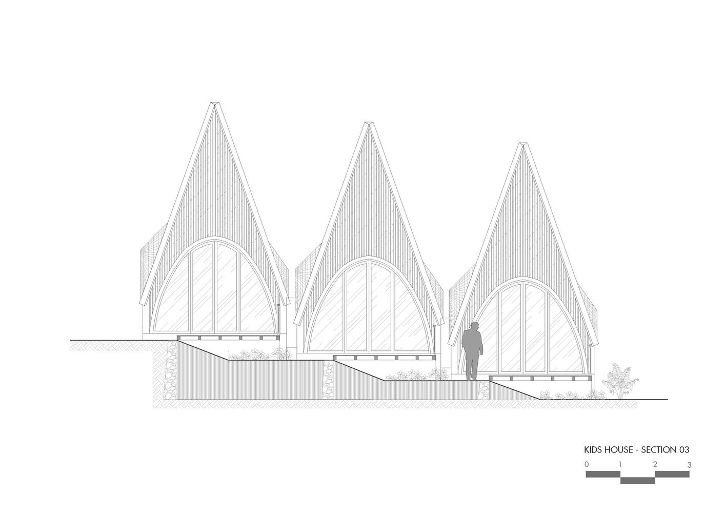 The ensemble includes a main house and three guest houses. Inspired by Sumatran architecture, the guest houses feature pointed roofs and arched windows that balance these dynamic forms. Strategic use of glass and wide overhangs help manage the indoor climate, protecting against rain and sun while maintaining natural light.