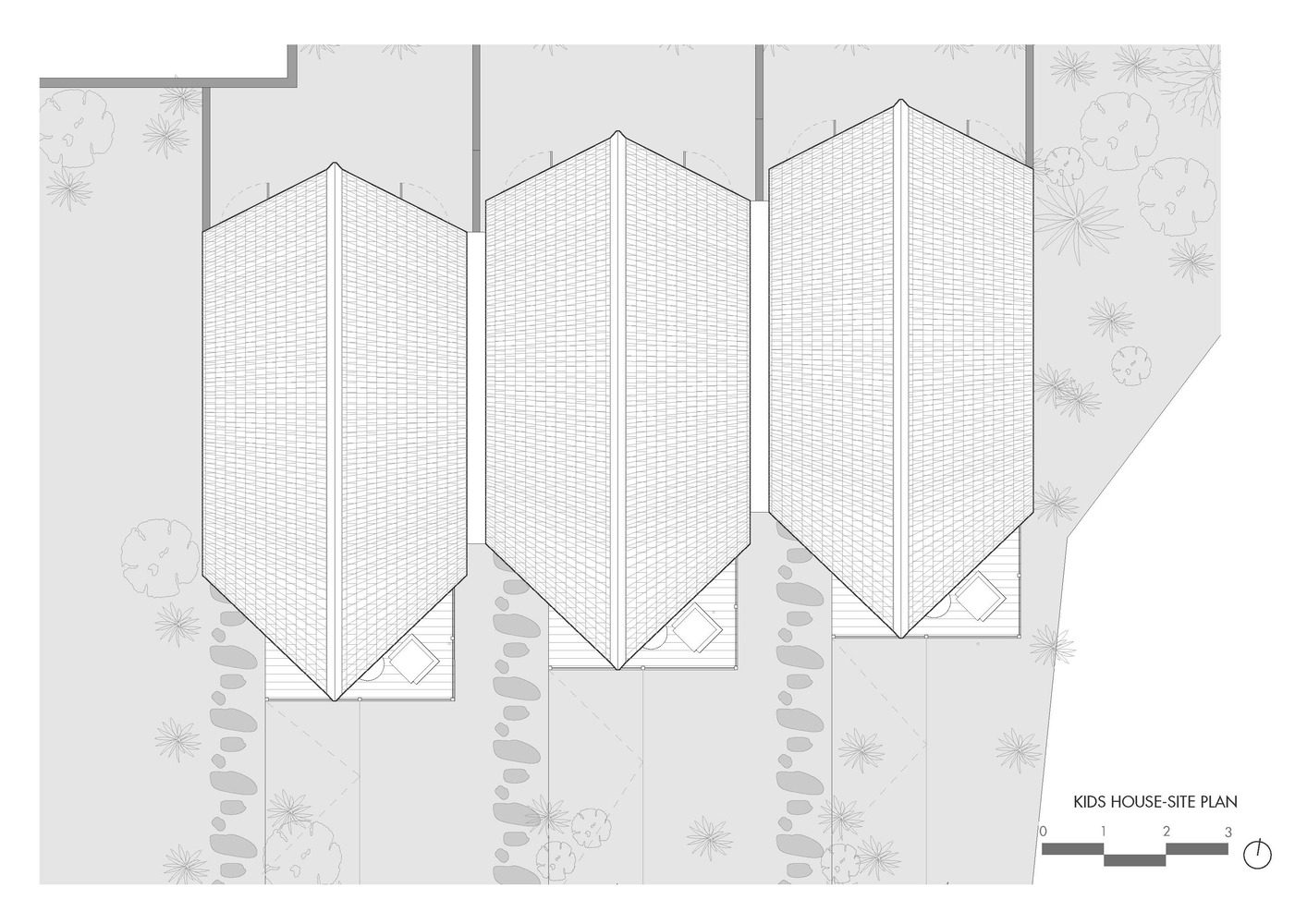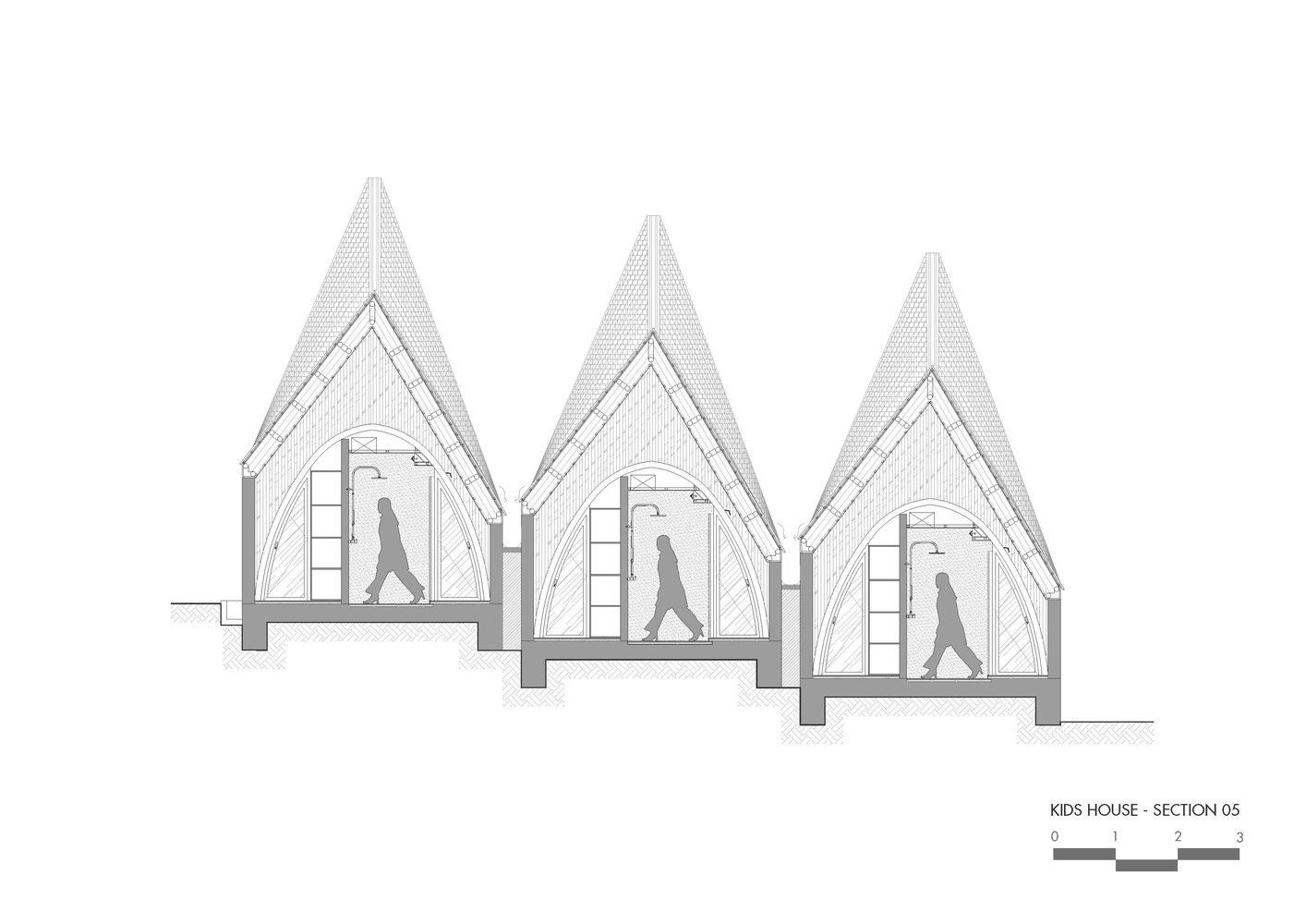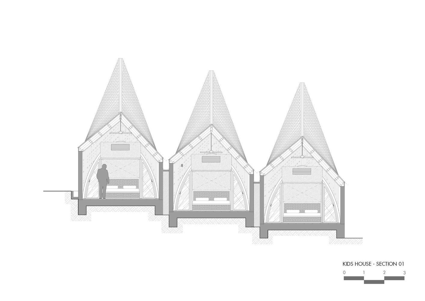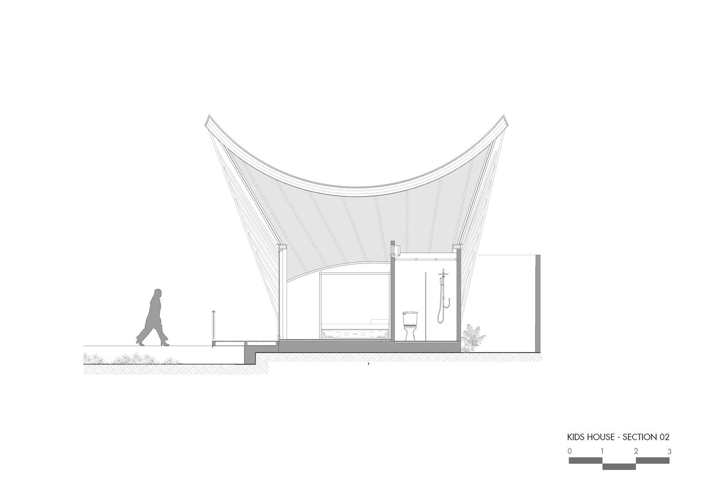 The ensemble includes a main house and three guest houses. Inspired by Sumatran architecture, the guest houses feature pointed roofs and arched windows that balance these dynamic forms. Strategic use of glass and wide overhangs help manage the indoor climate, protecting against rain and sun while maintaining natural light.
