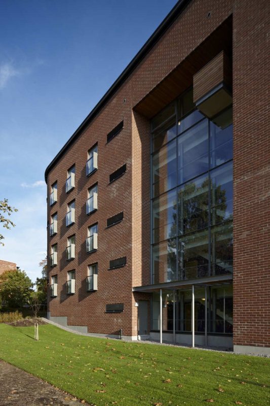 The two similar buildings form large curves toward the north blocking noise and tremor from the nearby street and railway. They also make a statement in a larger urban context, the suburban railway environment development.