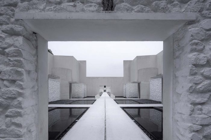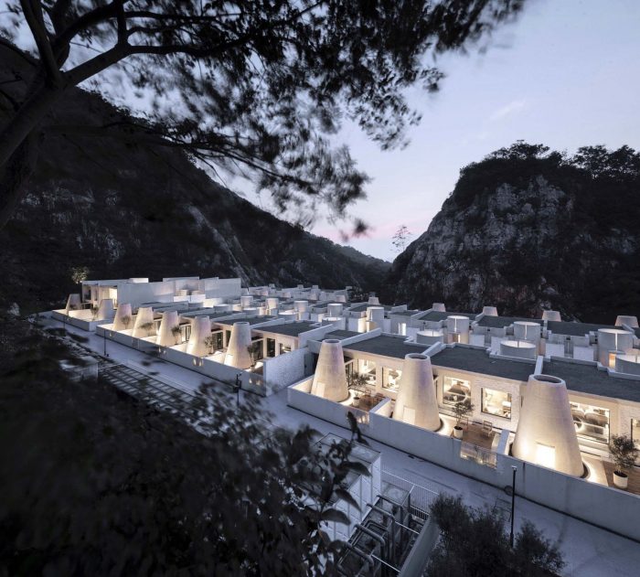 The entire architectural groups surrounded by the valley can be overlooked from the roof terrace. The concrete cylinders with high-density array, stone house roof and the precipice form the relationship between architecture and nature, and create the historical sense like a future site. The meditation space at the end of the north-south axis is a container for time and nature. The energy gathered by the north-south axis is divided here into two parts. One part continues into the valley walls, and the rest part diverts over the valley through the concrete cylinder, connecting sky and earth. Echoing with the local context of Tangshan homo erectus cave, continuous white cement interface is adopted for furniture, walls and floors of the guest rooms to create a relaxing holiday atmosphere of lying on the ground and bring the different romantic experience of “a high-class sense of only four walls in a room” in this hot spring hotel.
