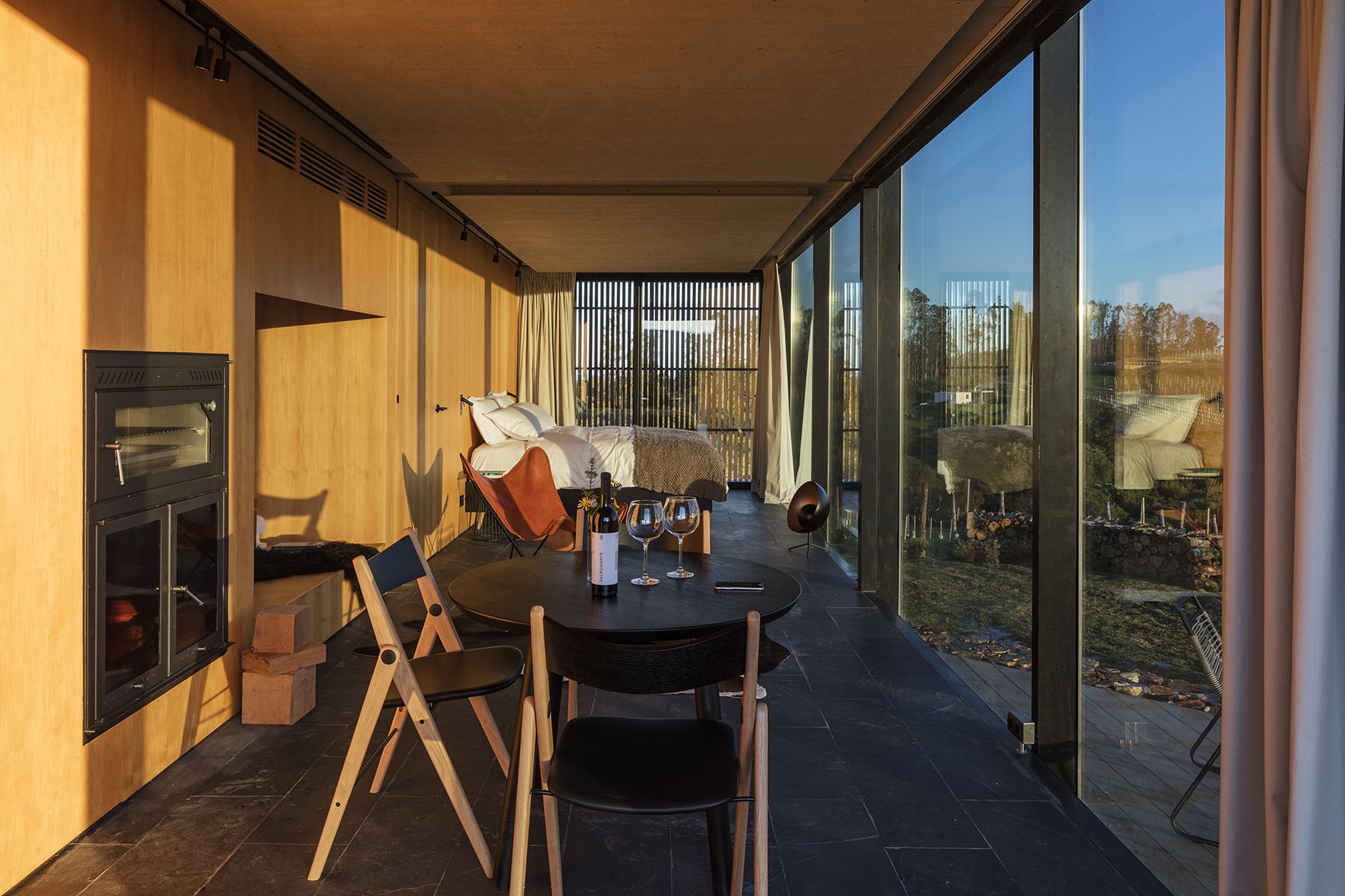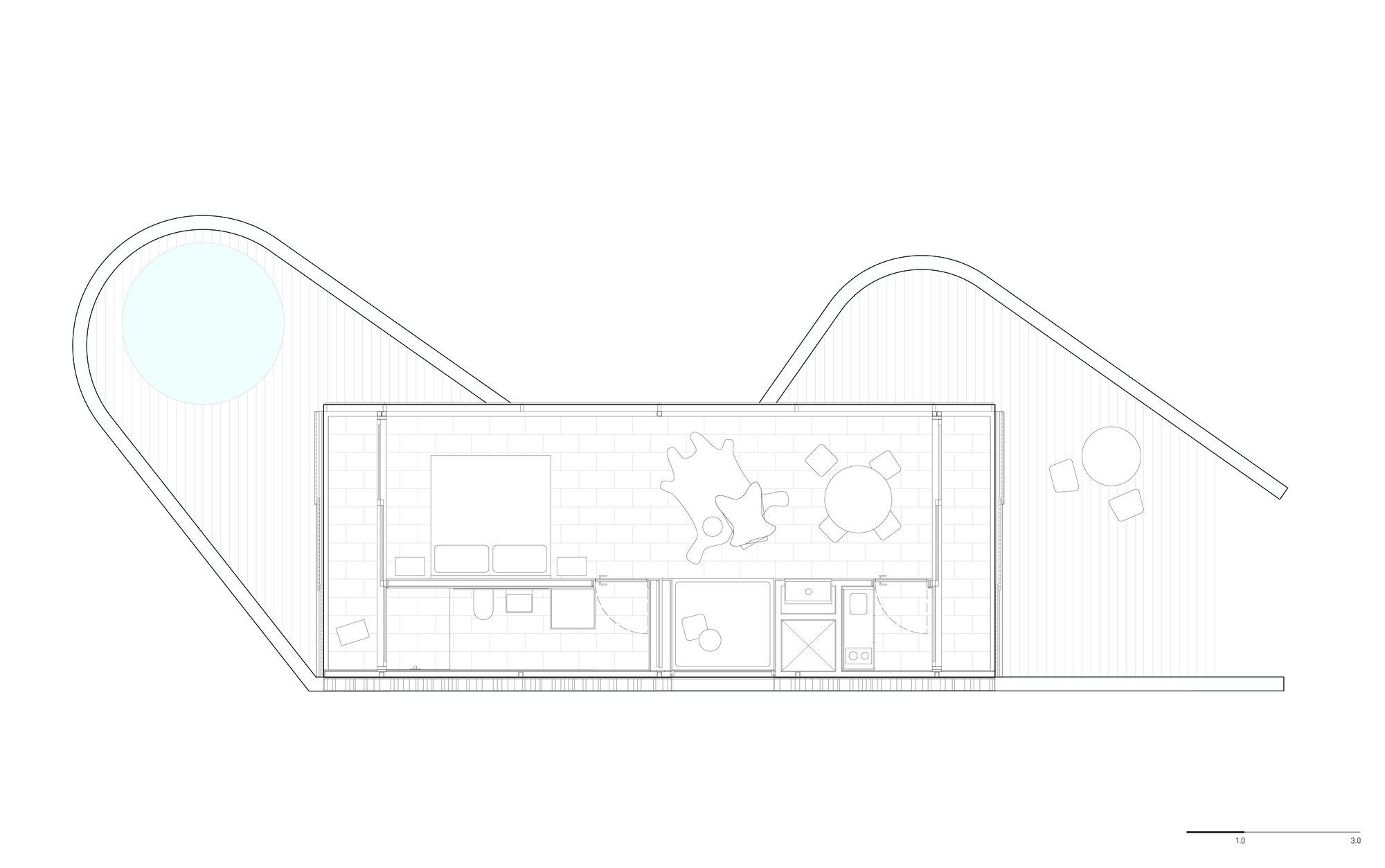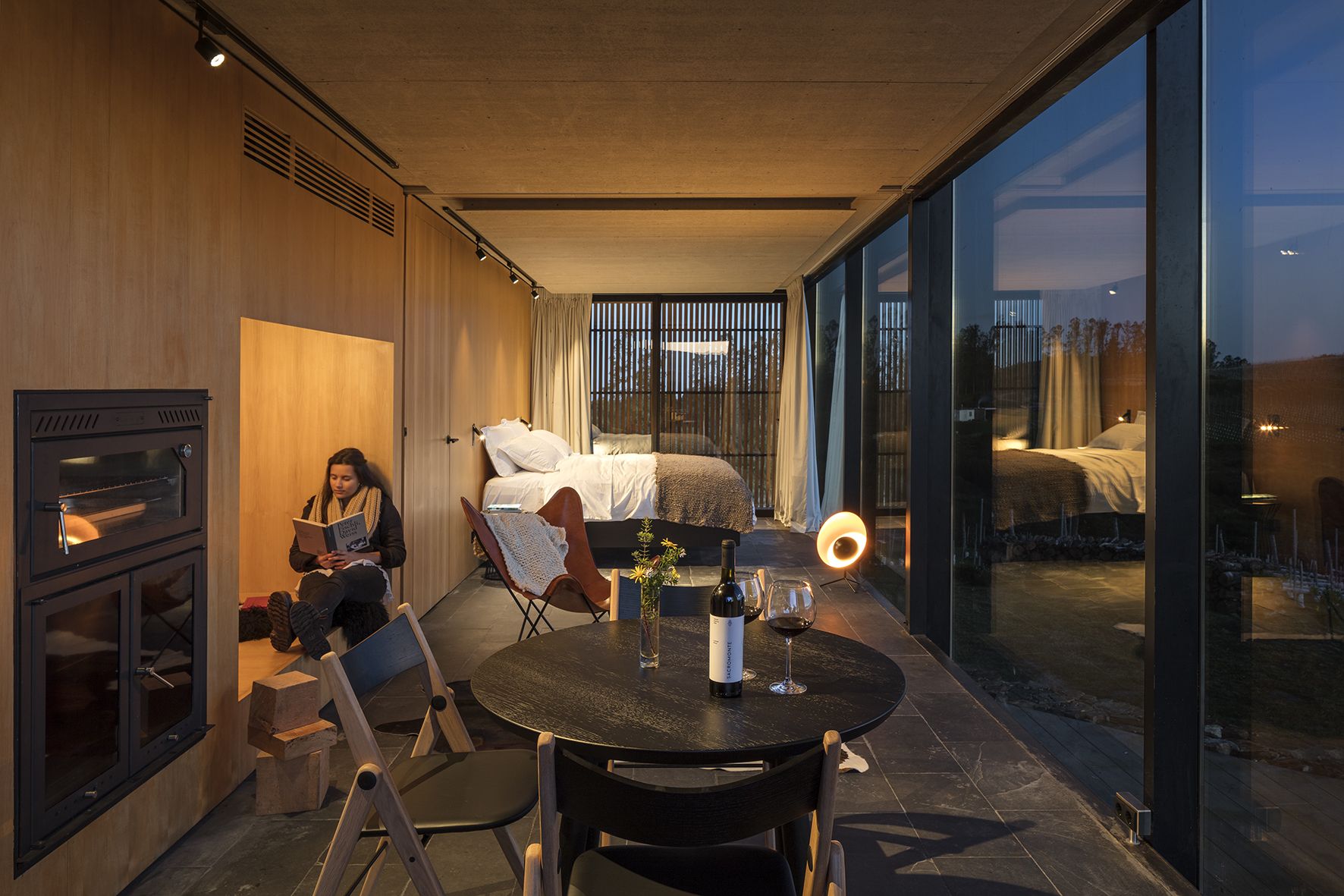 The following layer hosts the wet areas such as the bathroom and the kitchen, a fireplace and a reading nook ideal for just reading or sleeping a siesta, sheltered by the landscape. Separated by a wood plane, follows the main space containing the bedroom, living and dining room, which opens fully onto the landscape it is inserted in and of which it is an integral part.