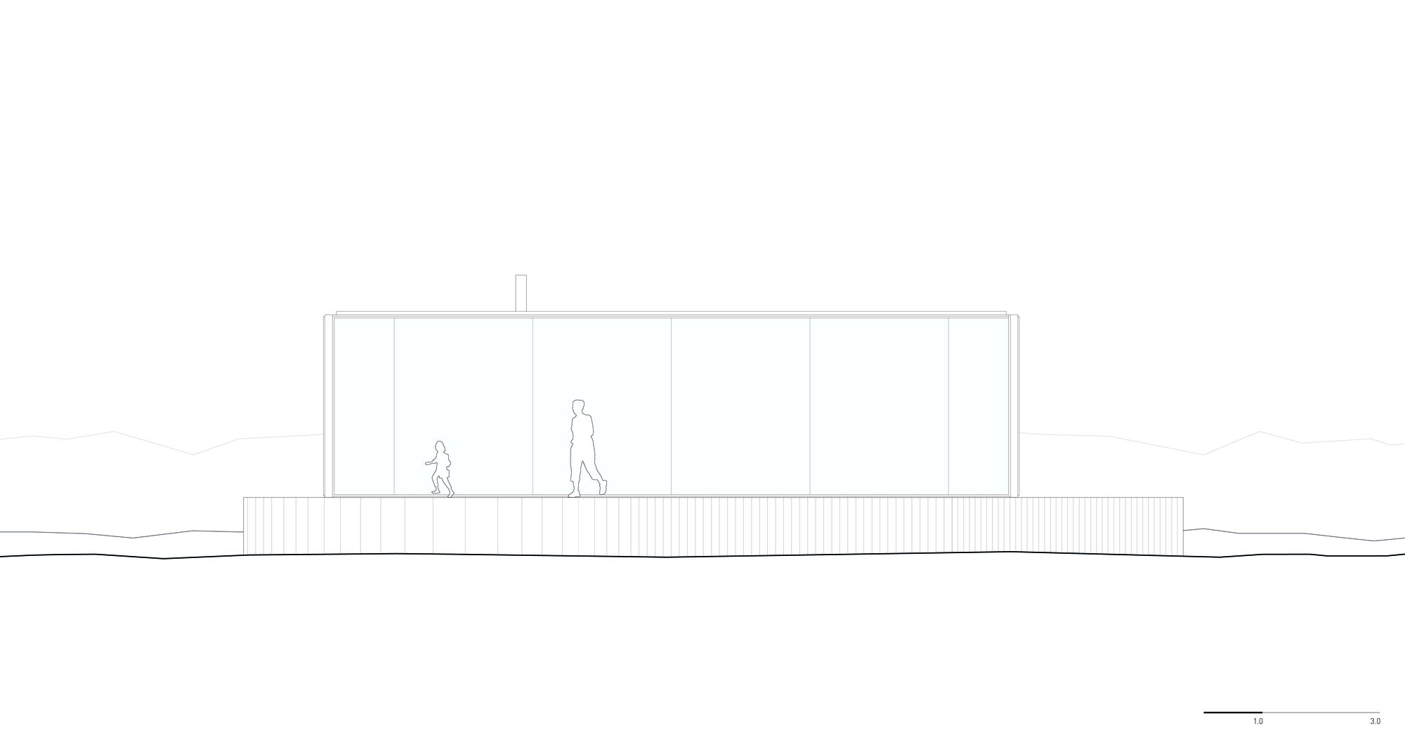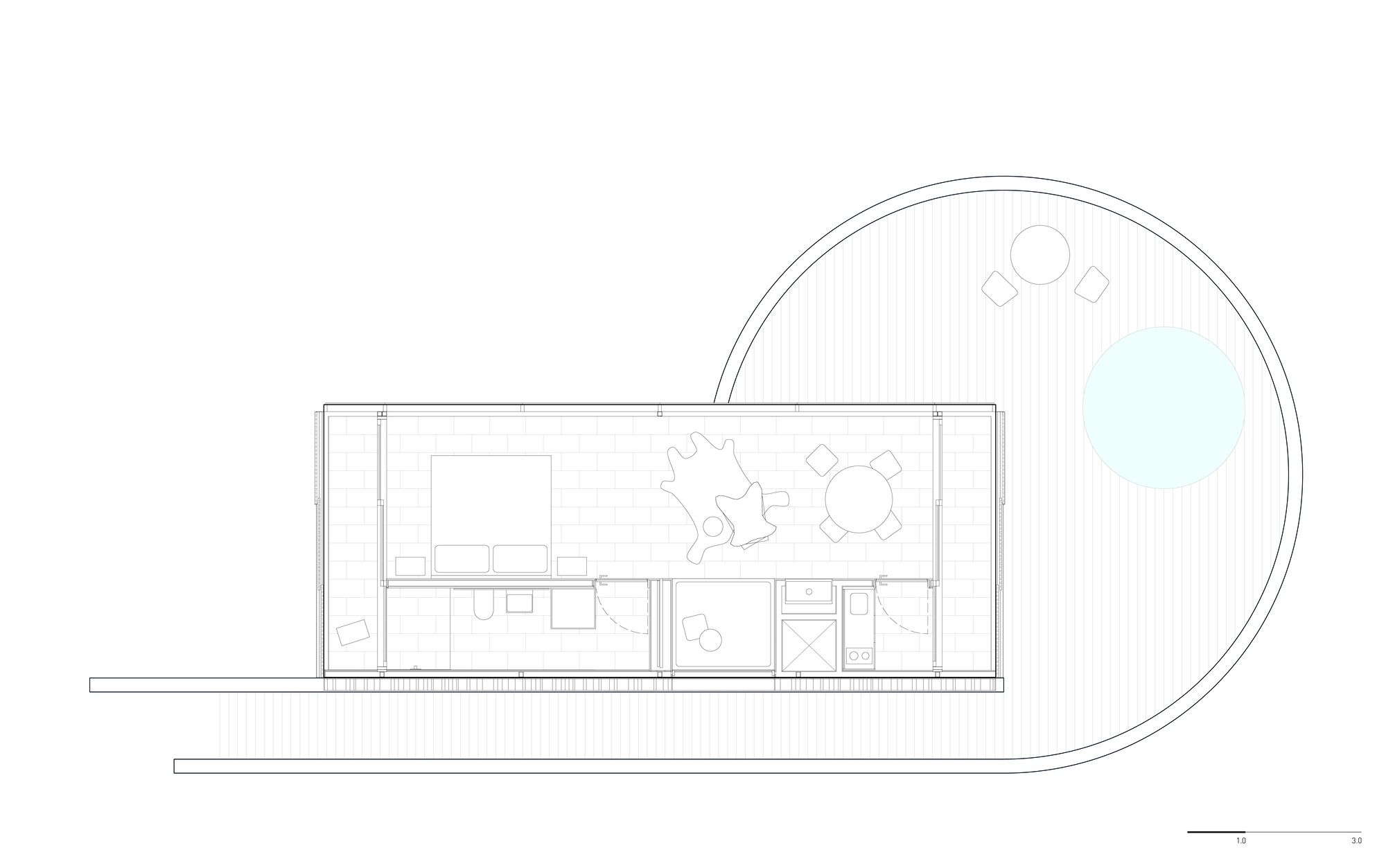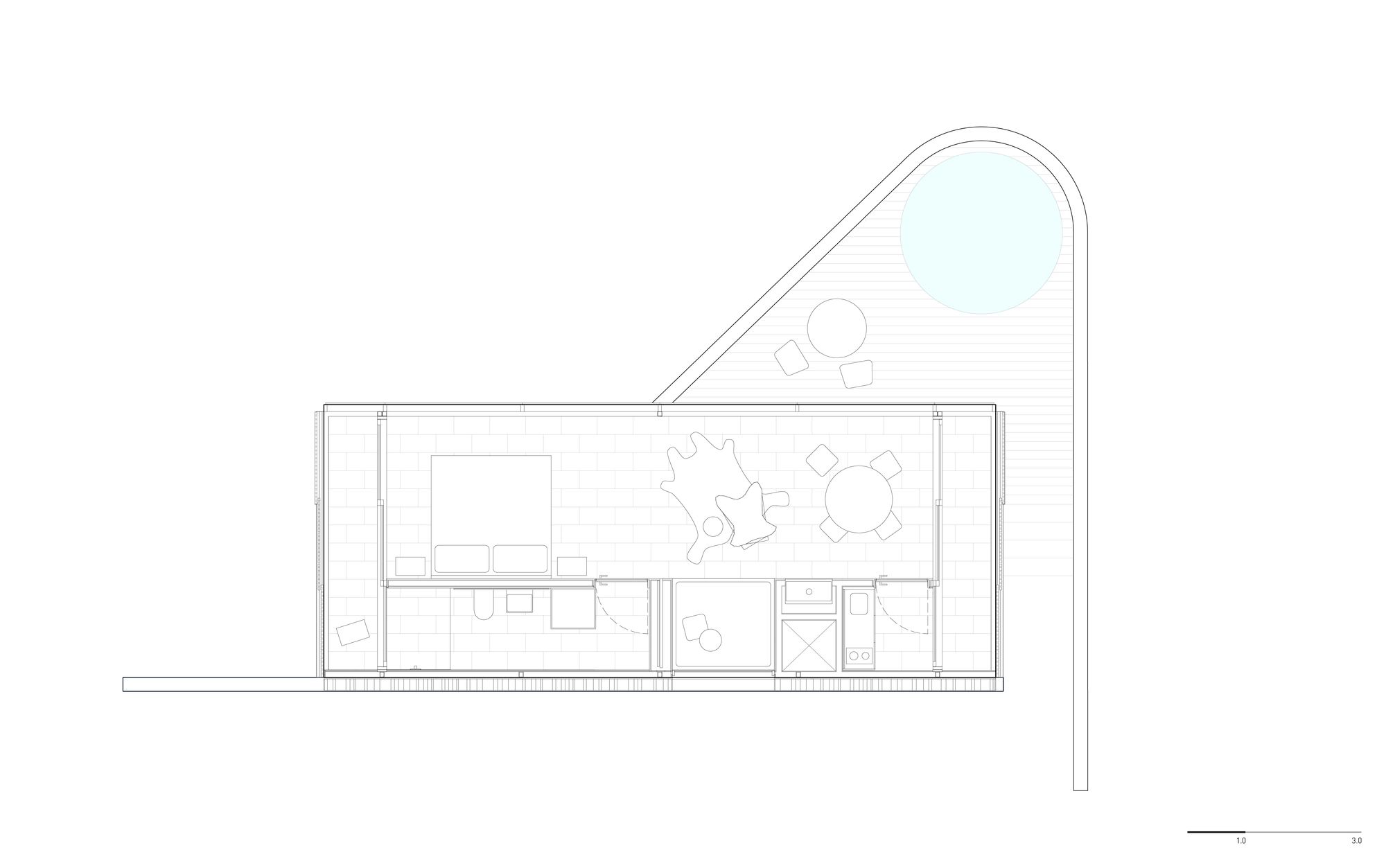 The following layer hosts the wet areas such as the bathroom and the kitchen, a fireplace and a reading nook ideal for just reading or sleeping a siesta, sheltered by the landscape. Separated by a wood plane, follows the main space containing the bedroom, living and dining room, which opens fully onto the landscape it is inserted in and of which it is an integral part.