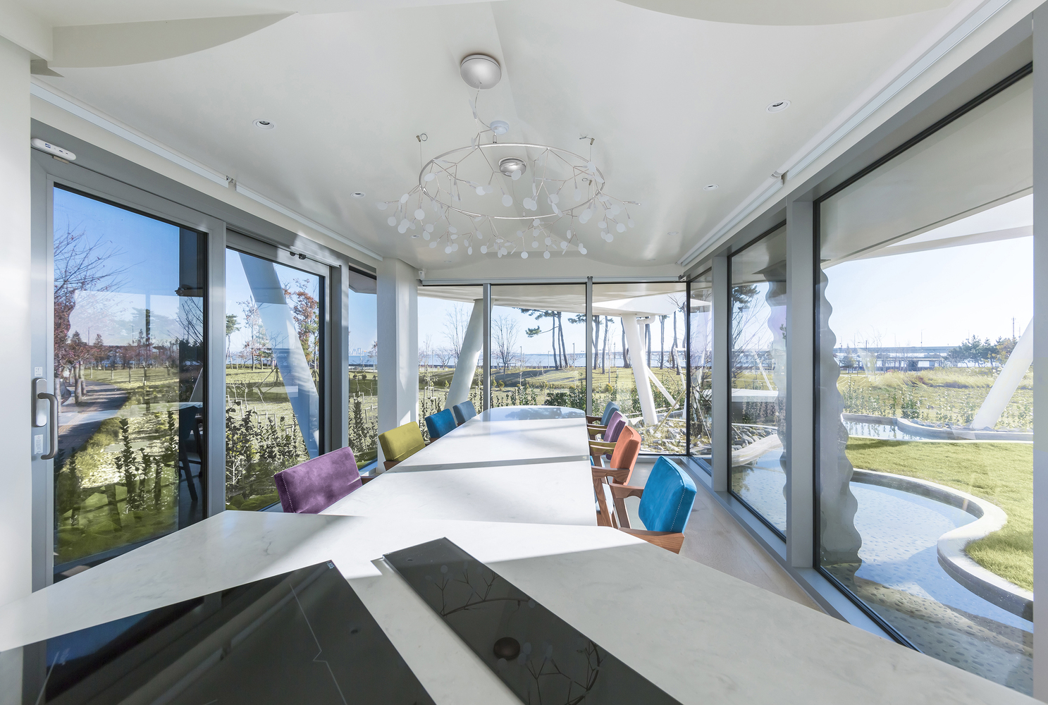 Recognizing the decreasing frequency of family gatherings in modern Korean society, the architects designed a theatrical public living space with a captivating seascape, encouraging family members to come together and connect. A nod to tradition, the concave curves reminiscent of traditional Korean architecture were cleverly incorporated into the design, evoking the image of a ship’s dynamic sail on the sea.