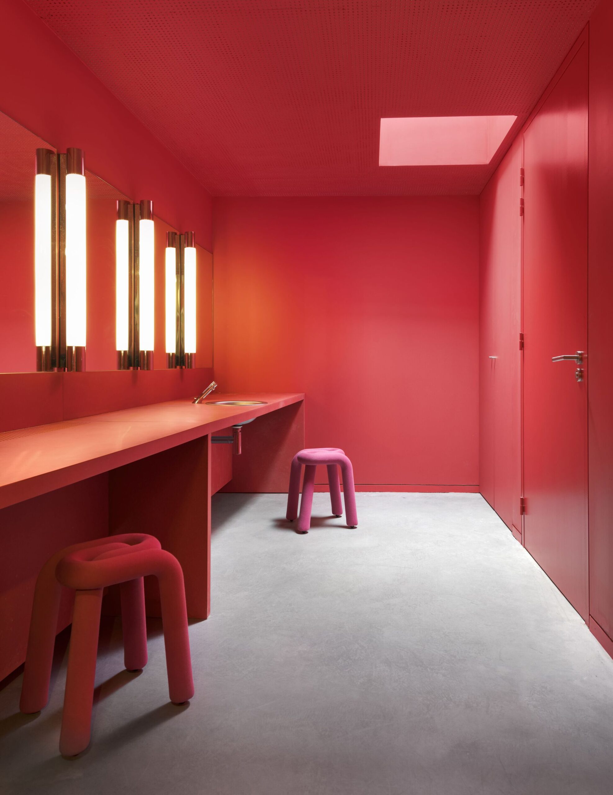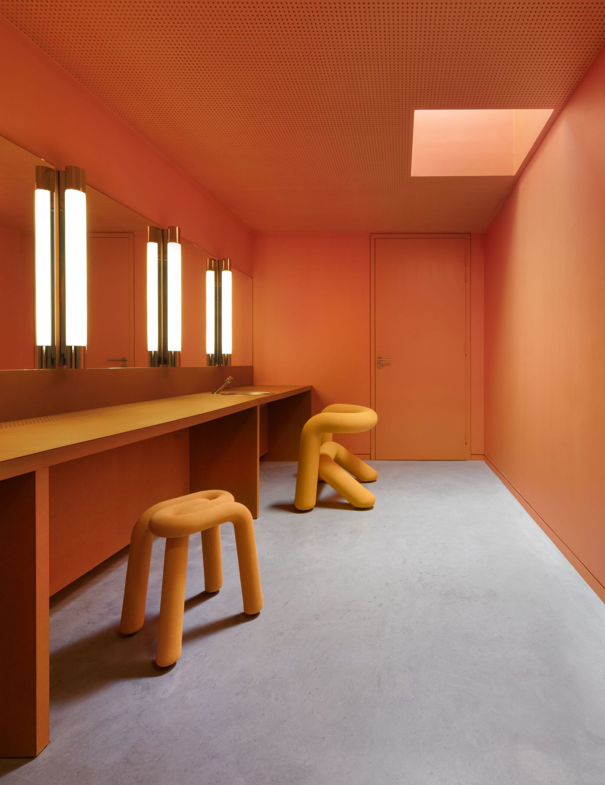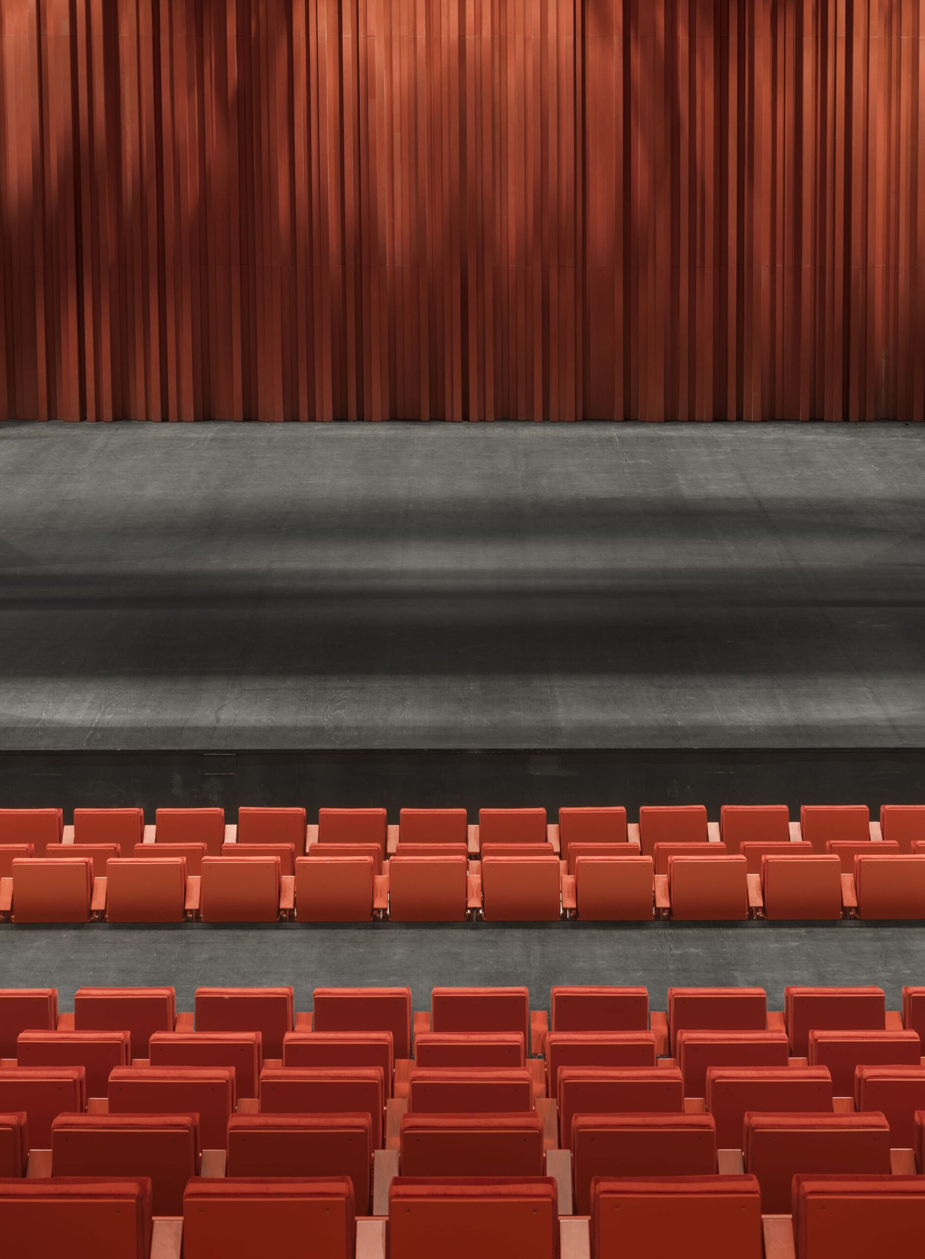 An atrium stretches up, like a self-evident feature, between two parts: to its east, a vast theatre; to its west, three levels that contain superimposed sections – a music school, theatre rooms and dance studios. This triple height gives the place a noble aspect. The atrium stands out as the centre’s beating heart that unites all the functions of the architectural programme within a collective structure and a site for sharing – a centre for togetherness and coexistence.