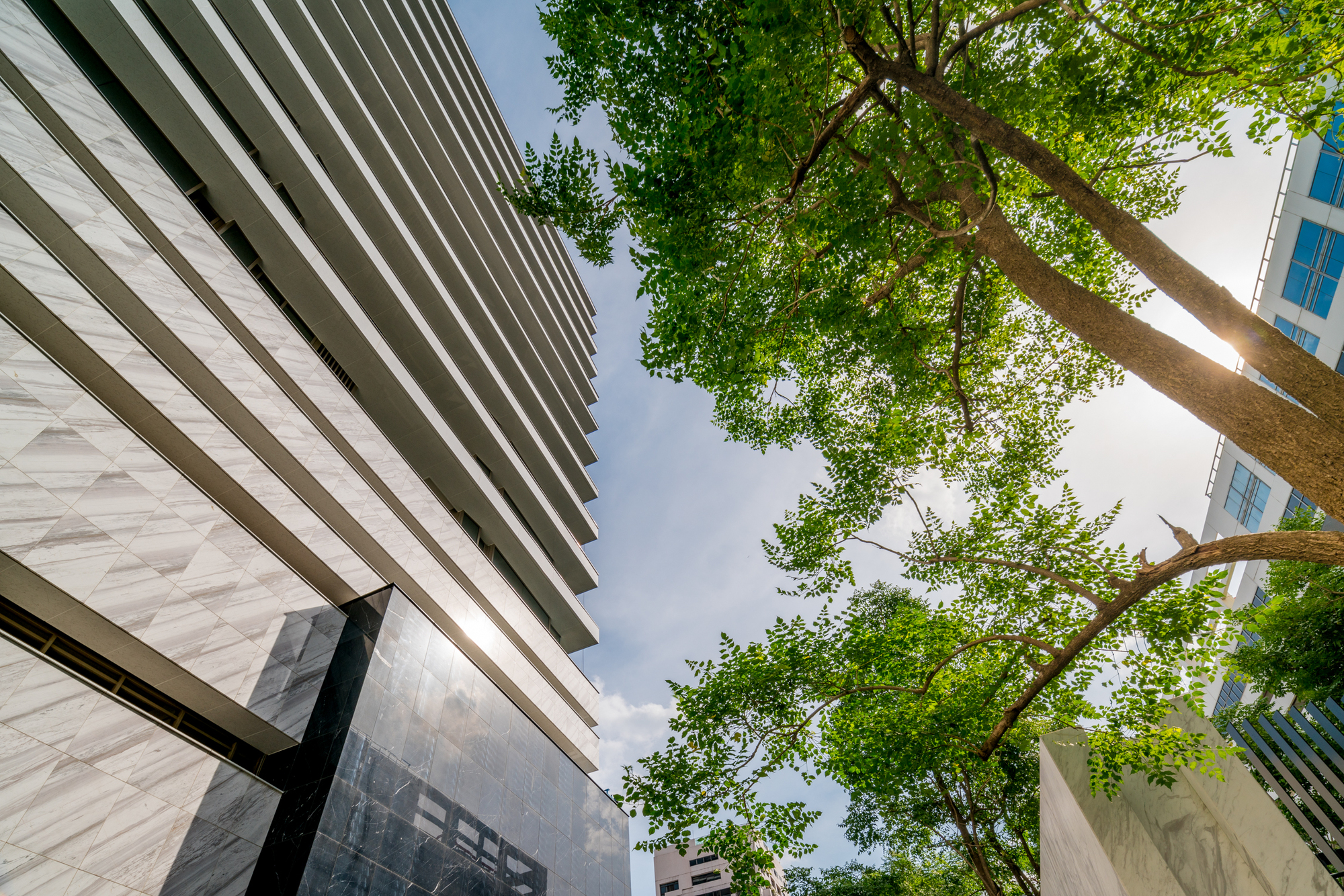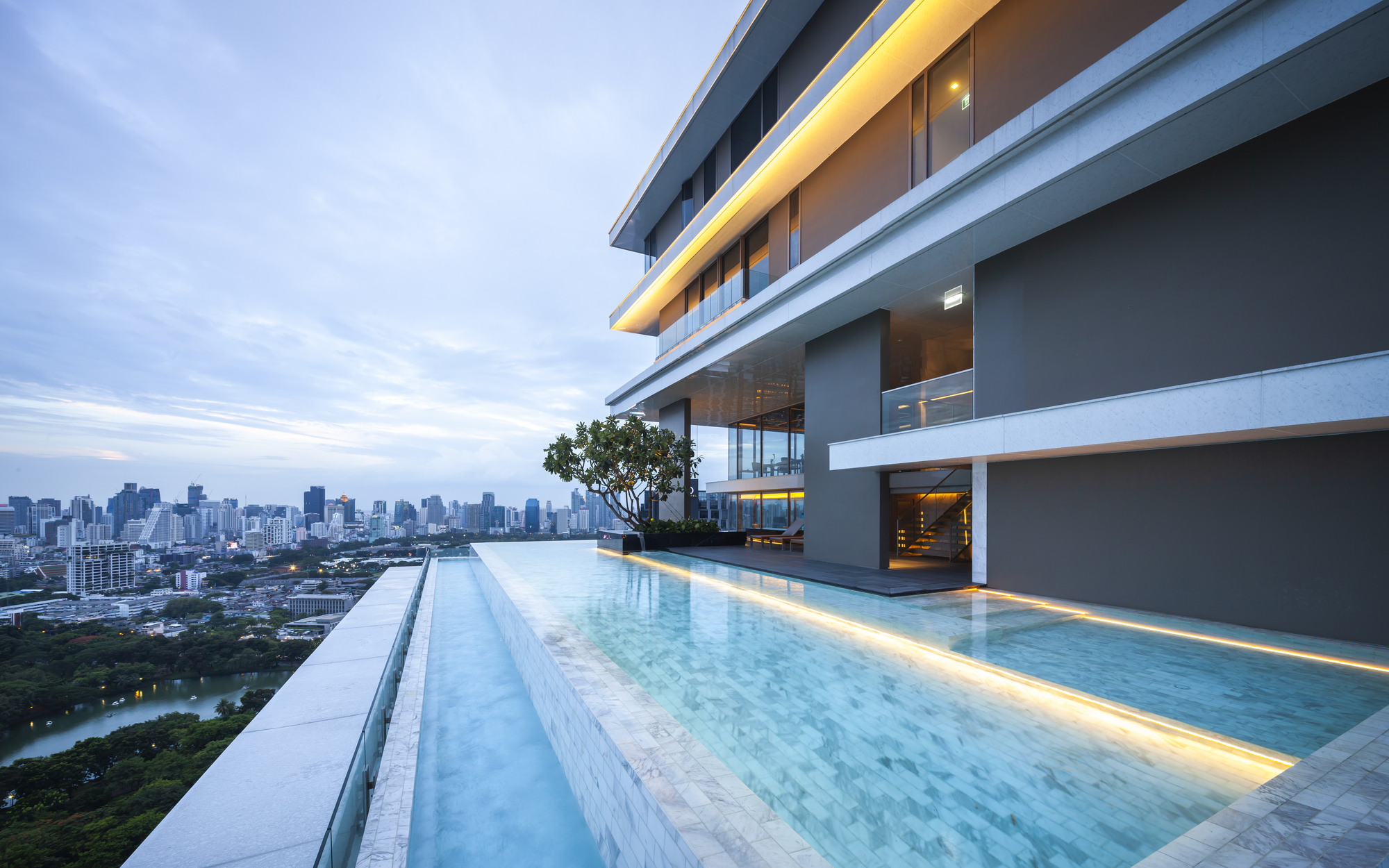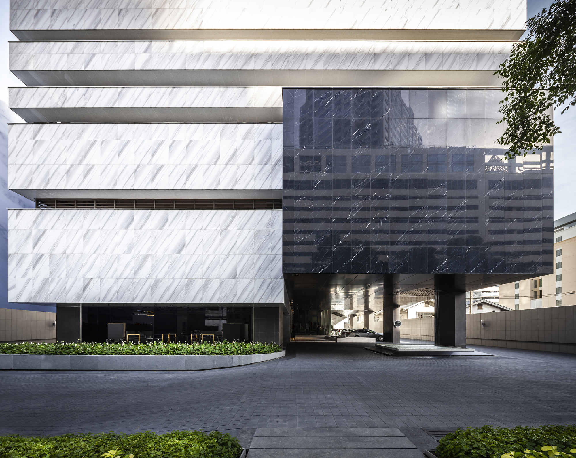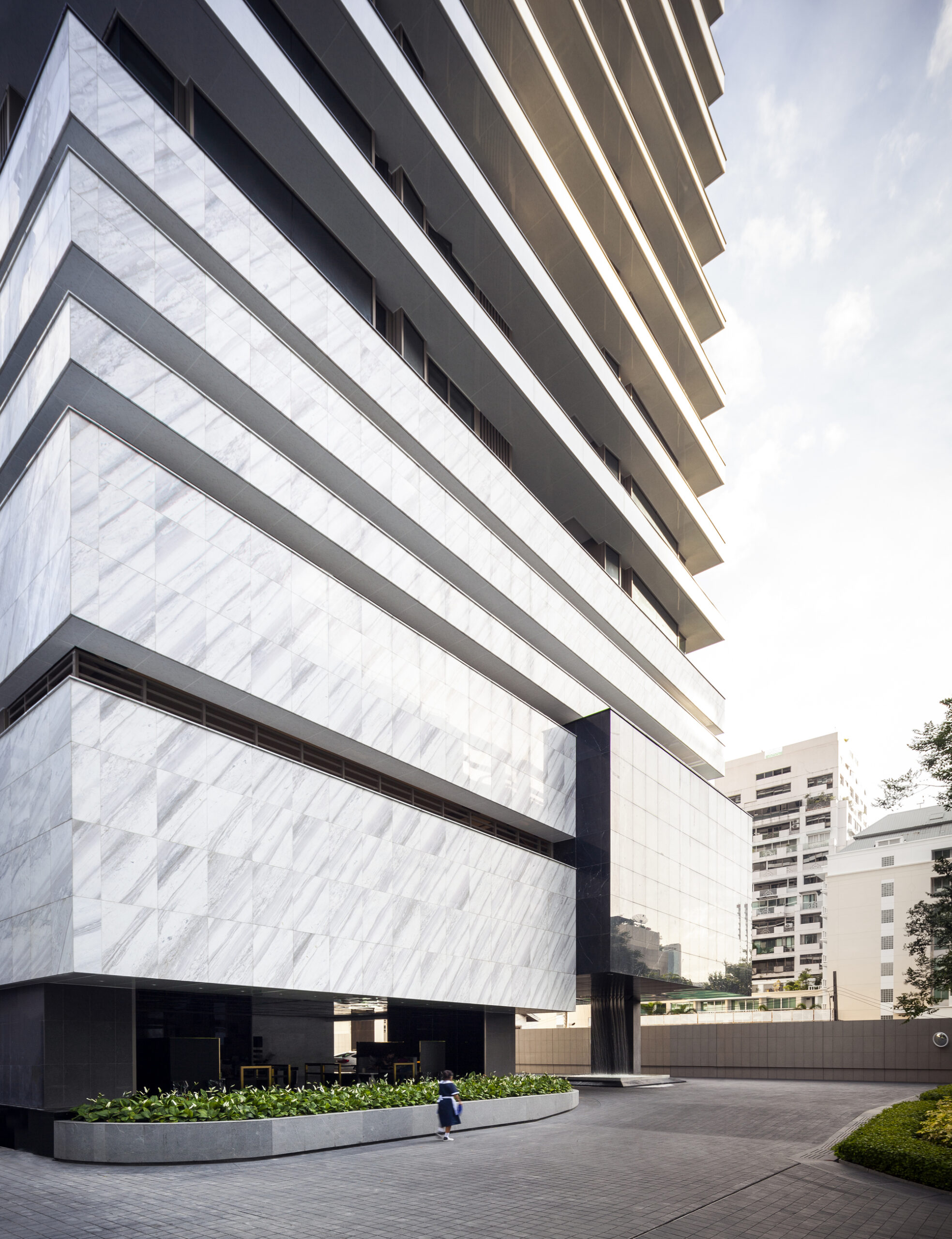 Marble Accents: While the overall building is composed mainly with the impression of white marble, a few accent spaces, such as the entrance canopy is highlighted by inserting a contrasting block of black marble to float above the space. The building crown, on the other hand, become a glowing block floating at the very top to signify the project’s unique architectural identity among other great high rises of Bangkok skyline.