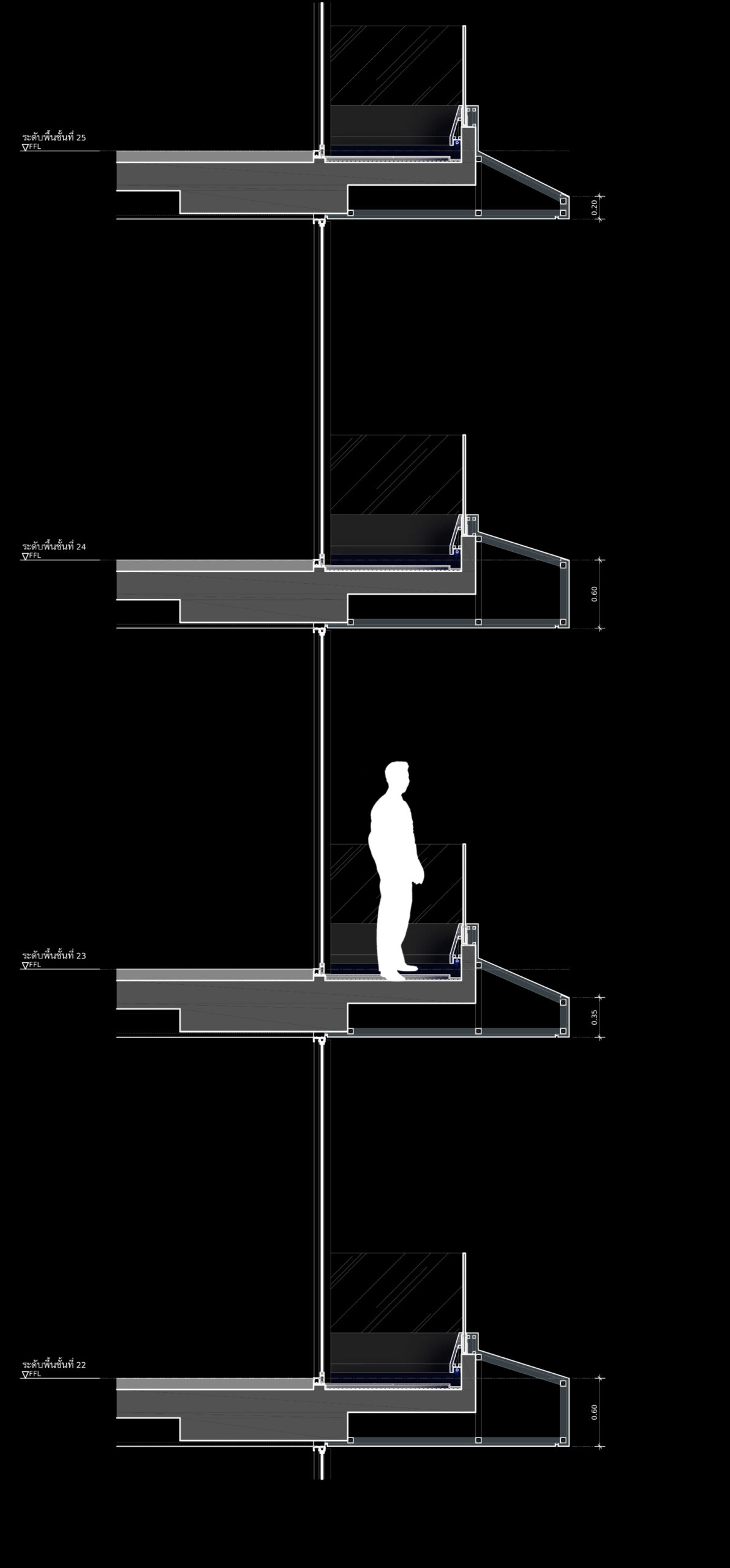 Angled bay window is another feature that responds directly to complexity of urban surroundings, residential preference and tropical orientation. In simple words, all windows tilt and turn individually towards the best view, away from obstructing neighbors and excessive Sunlight. The result is a complex texture on the façade, reflecting sky colors from different angles inserted between horizontal fins. This also creates Angles Bay Window space which is surprisingly functional and very unique from inside residential units.