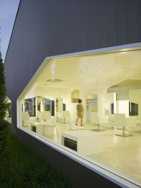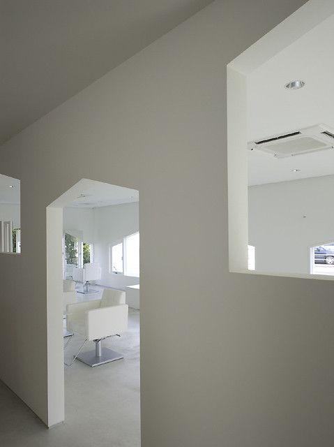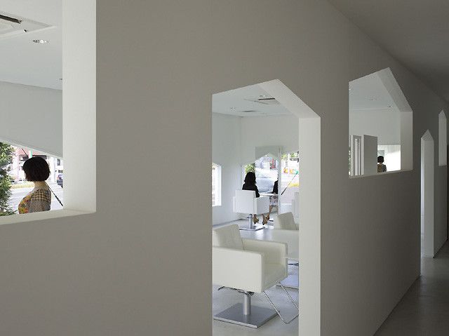 Salon O was designed by Takao Shiotsuka Atelier, It is a hair salon O built in the suburbs. A mountain type design code is repeated from the facade and an opening to interior design. This brings the visual effect of an icon to construction. “Paper-cutting” will be a motif if it says.