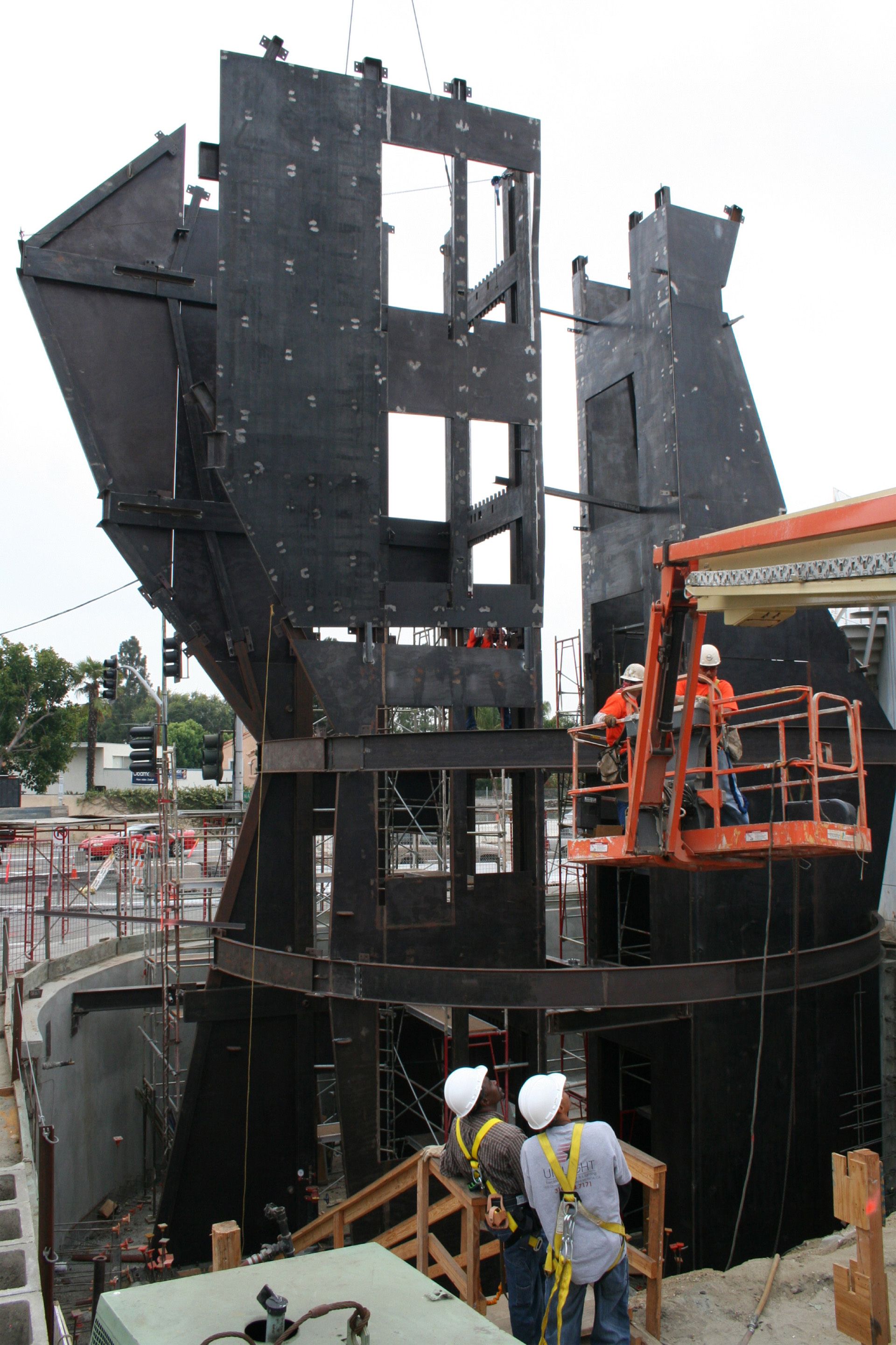 The Samitaur Tower in Culver City, California is an odd but attractive and iconic landmark designed by Eric Owen Moss Architects and located along routes of both intense automobile and train-based transportation. Standing at 72 feet in height, it peaks above surrounding buildings which must adhere to a strict 56 foot height limit, drawing attention to itself and the images it relays.