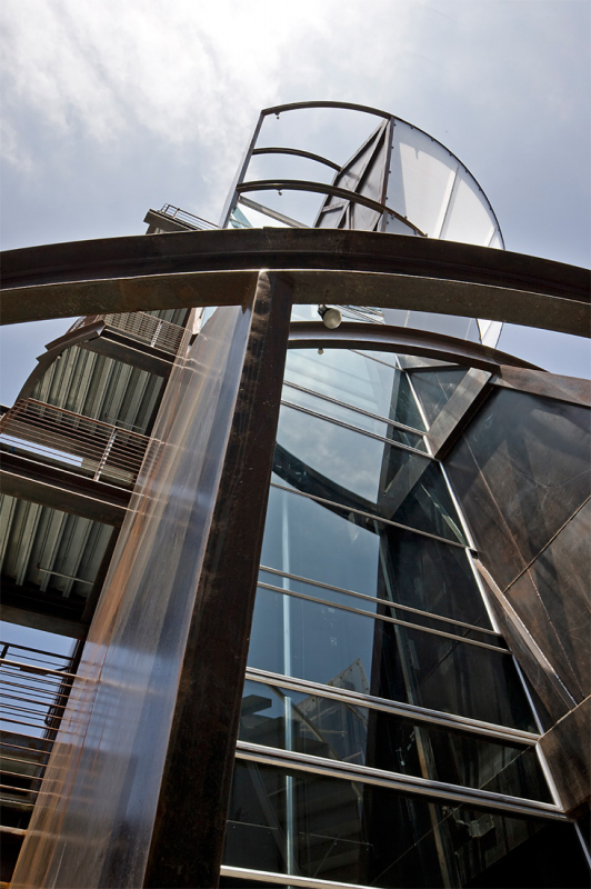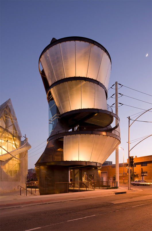 The backside presents a sharp statement about the surrounding industries of showbiz and showmanship. A stark, steel-clad, flat backing confronts the viewer- expecting to see a continuation of the front-viewed rings. Punching out of this rigid backing are landings for the open-air staircase which climbs to the summit of the lookout. The tower offers itself as just that- a lookout to the surrounding areas, as well as a forum for display to a captive and willing audience.