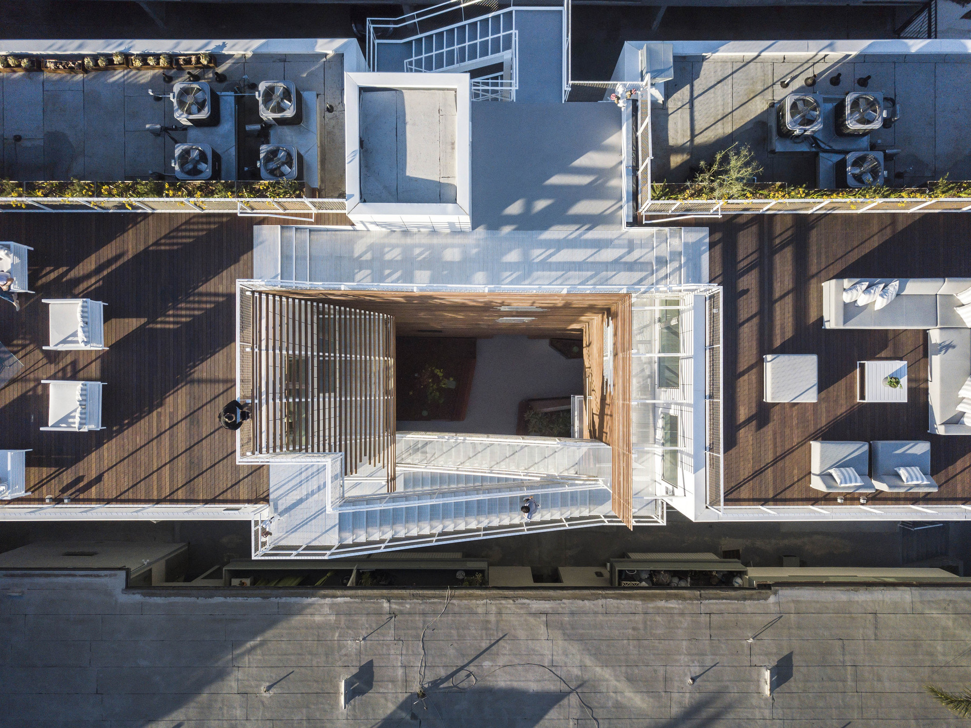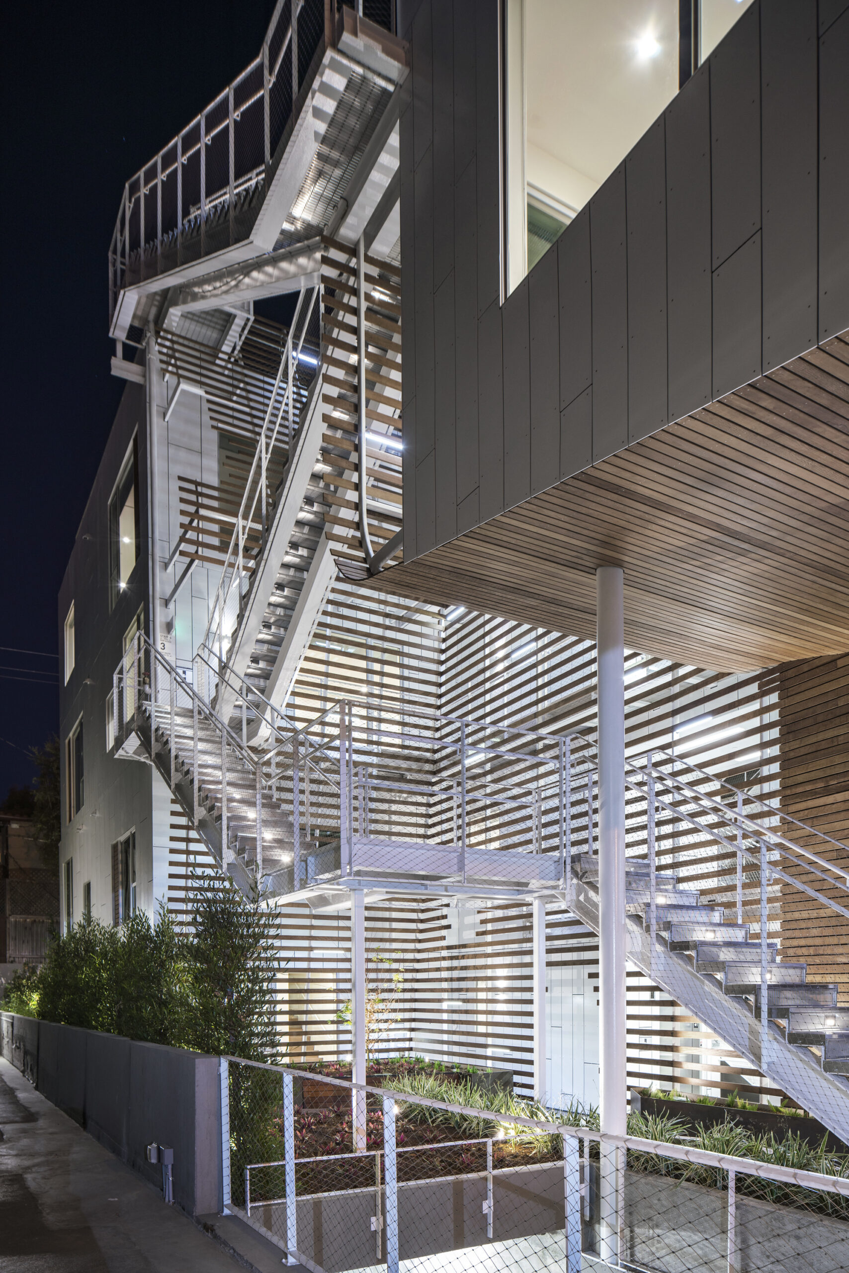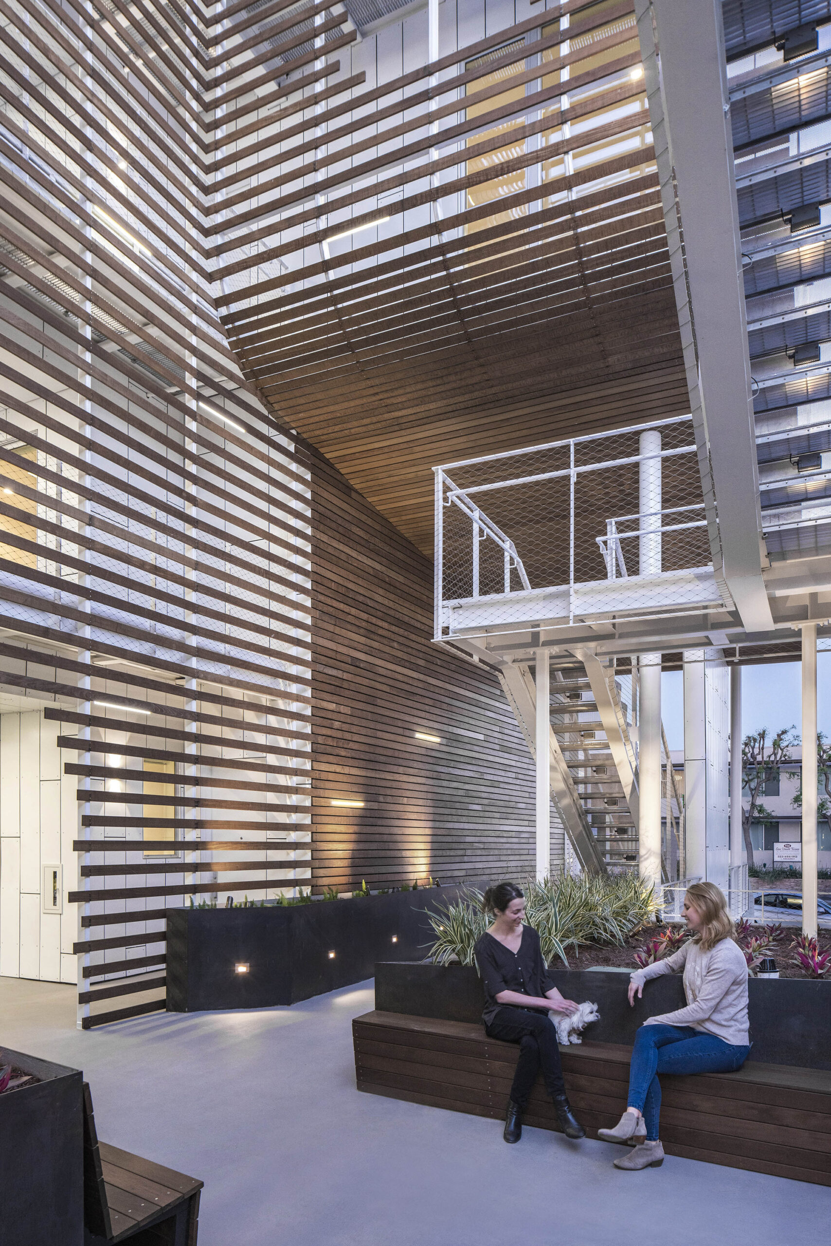 All circulation, including the primary exterior sculptural stair, is set within this common courtyard, encouraging social interaction and a sense of community between residents and visitors. Integral to the design, this centrally located amenity allows all units to have exterior access directly from the courtyard, while eliminating the need for mechanically climate-controlled corridors. The courtyard design is programmed with seating areas, a water feature, and various plantings.