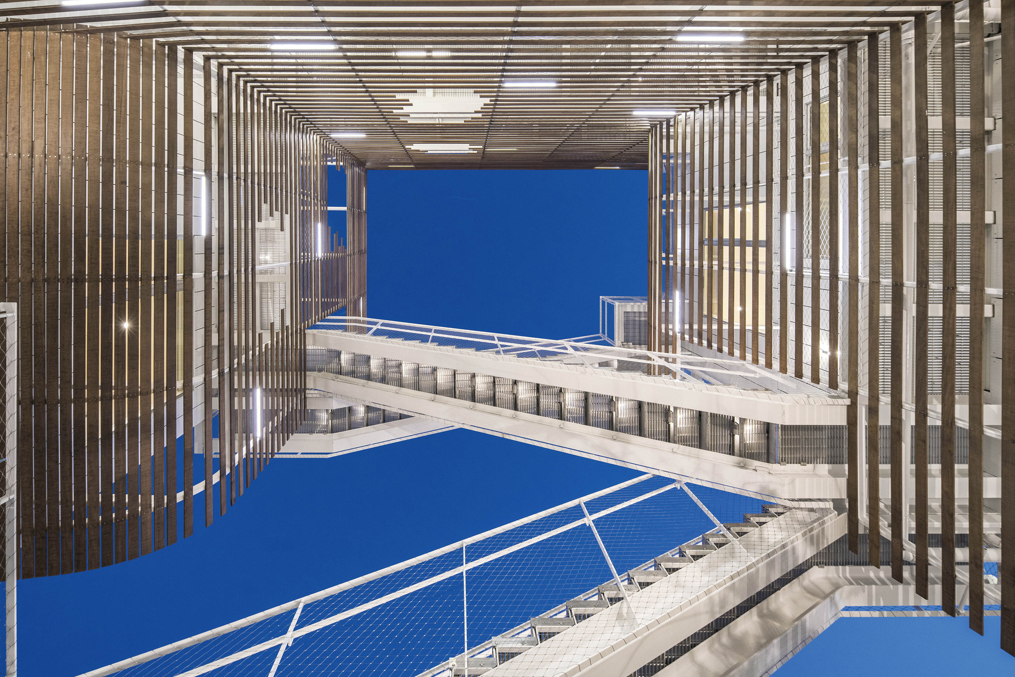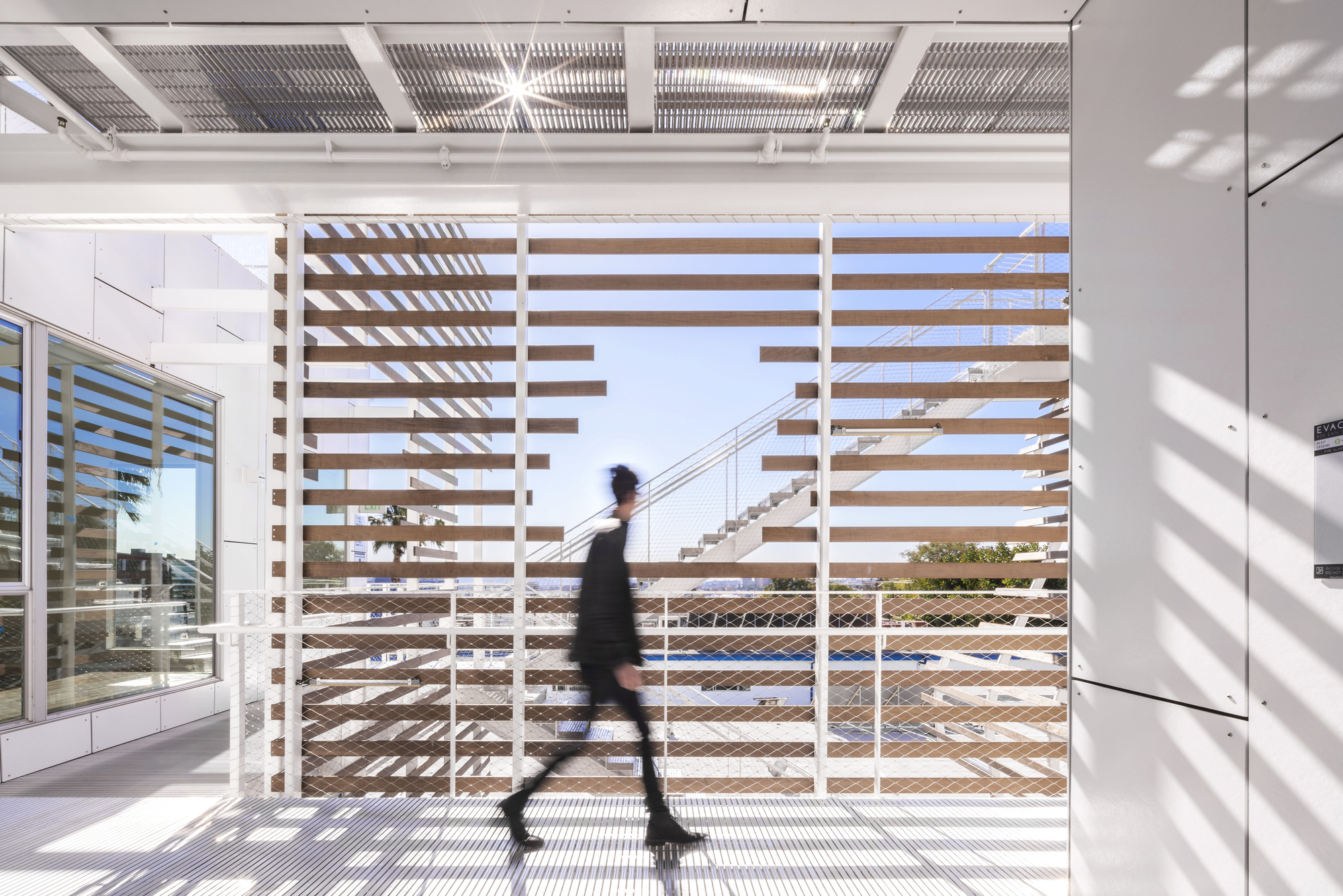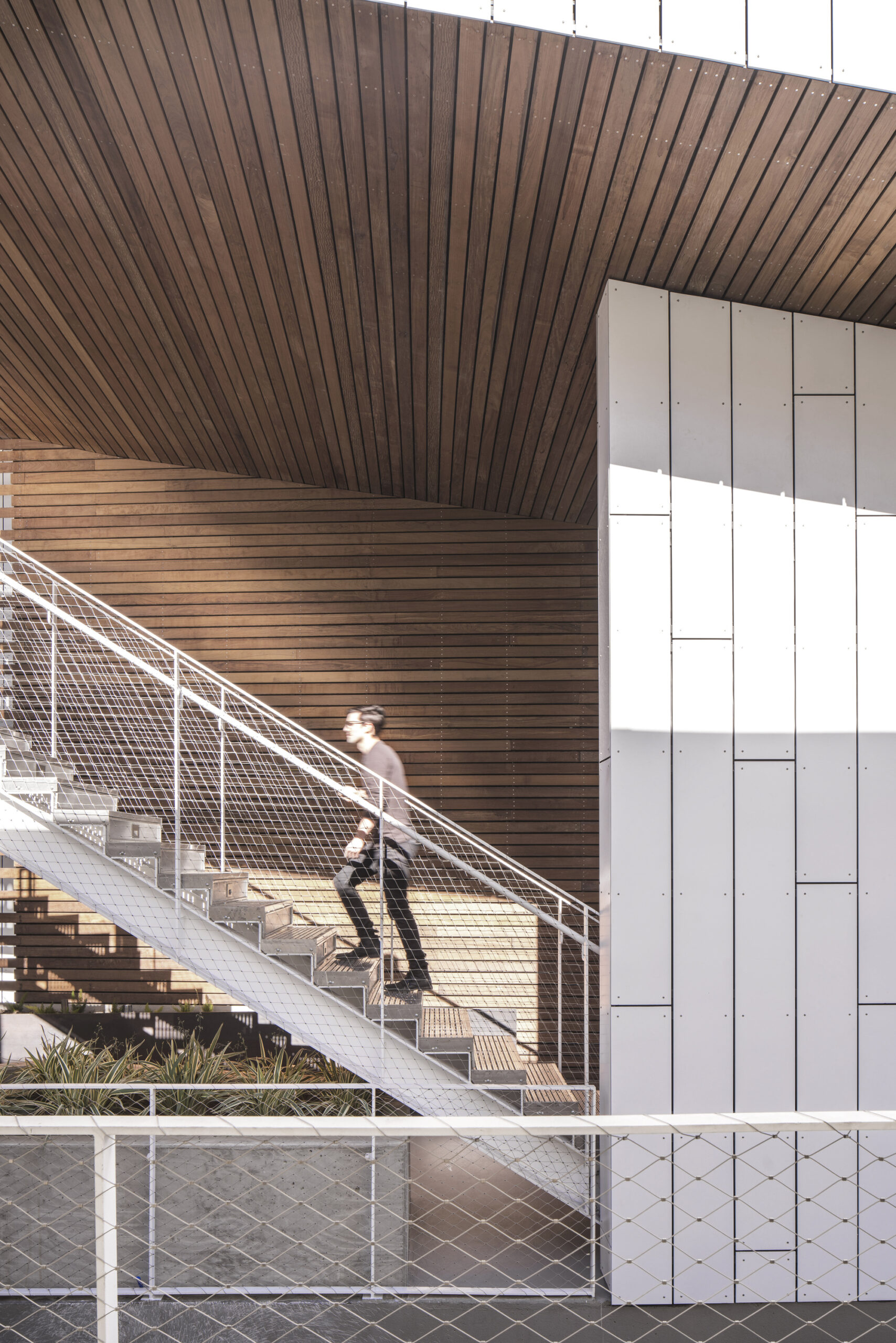In an effort to extend the street into the building, one quarter of the main elevation facing San Vicente935 is carved away to provide a direct visual and physical connection between the street and the courtyard space. Emphasized by both material and form, the double-height void provides an open, light-filled passageway, while reducing the project’s mass at the street front and contributing porosity and visual accessibility to the project.