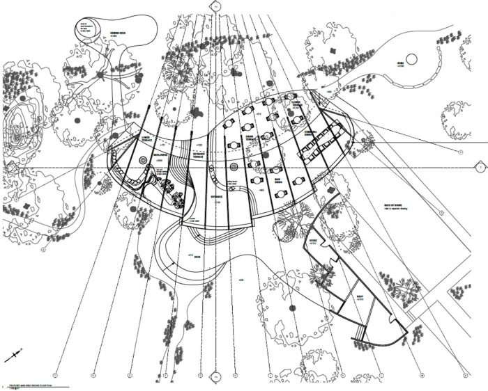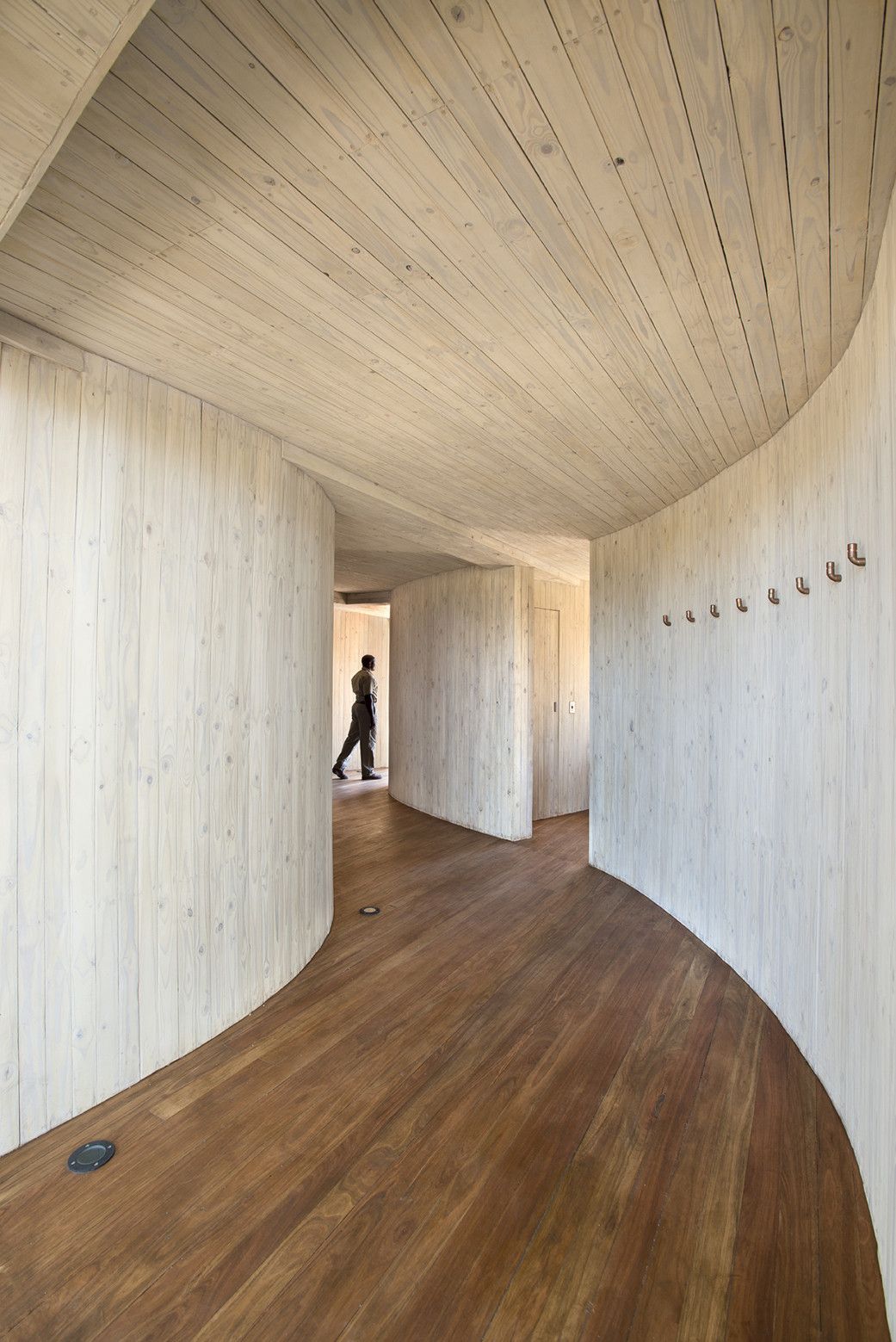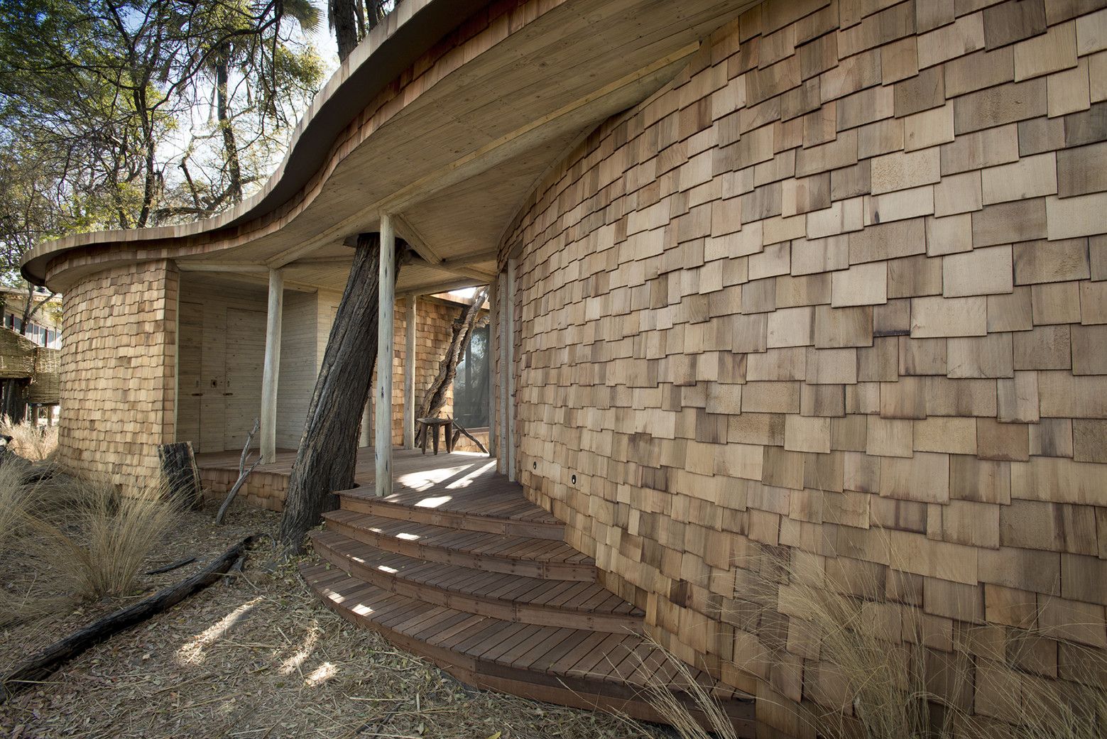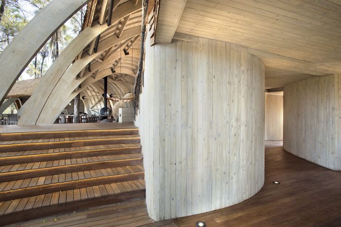 Sandibe is built almost entirely of wood. Laminated pine beams give curvilinear shape. The building skin is formed like an inverted boat from layers of butt-jointed pine scale planks; waterproofed with an acrylic membrane and covered in Canadian cedar shingles. There is no glass other than in the retail shop and library, the “glazing” such as it is, is Serge Ferrari Soltis fabric – a permeable but highly weather resistant and thermally efficient membrane.