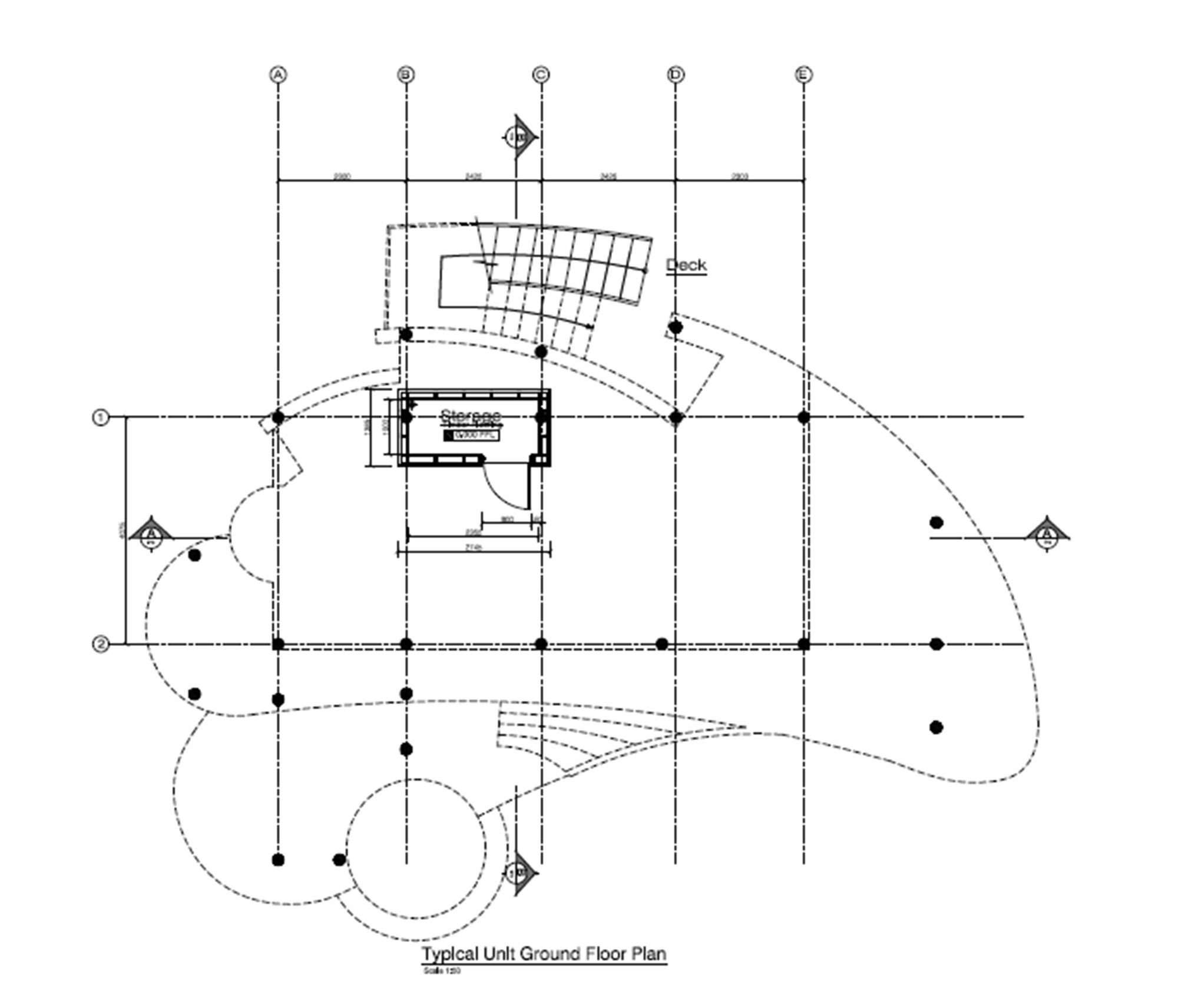 External screen walls and balustrades are fashioned from an interlocking mat of eucalyptus laths woven onto a stiff wire. Decks and floors use FSC approved hardwoods. Power is sourced from a 100 KVA PV array that means generators need only run for 3 to 4 hours a day. Hot water is delivered instantly even at the furthest cabin from a solar array of evacuated tubes backed up by heat pumps continuously pumped through a 2,5km ring main. Notwithstanding the distance, the measured loss of temperature between a source and furthest tap is 1.7 degrees.