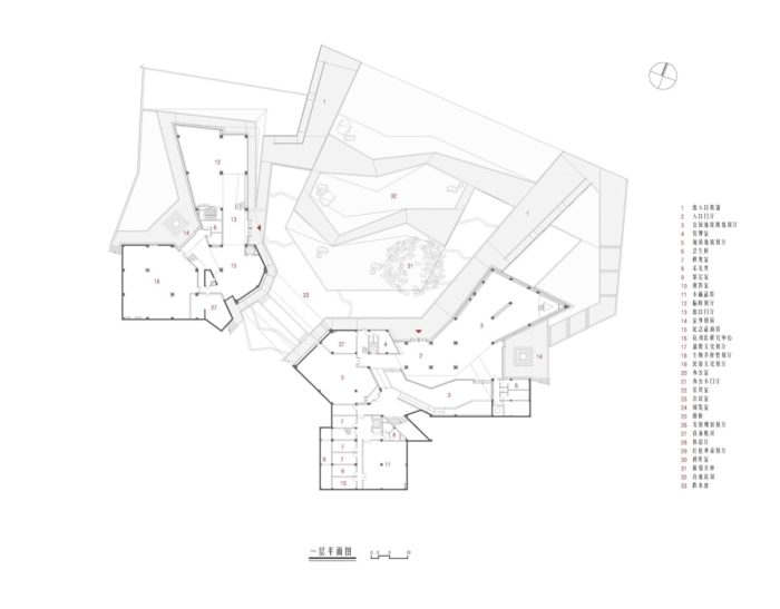 The Sanqingshan Geological Museum’s architectural structure significantly impacts the layout of its interior spaces. Visitors start their journey from the gently sloping northeast entrance of the site. They walk beneath a majestic ancient tree before reaching the Sanqingshan Geological Museum entrance and foyer. This is where the exhibition route begins, allowing visitors to ascend to the first floor from the eastern section, cross the corridor to the western hall, and then descend back to the first floor to reach the exit. Along the way, visitors can enjoy the beautiful views of the square, the camphor tree, and the distant mountains.