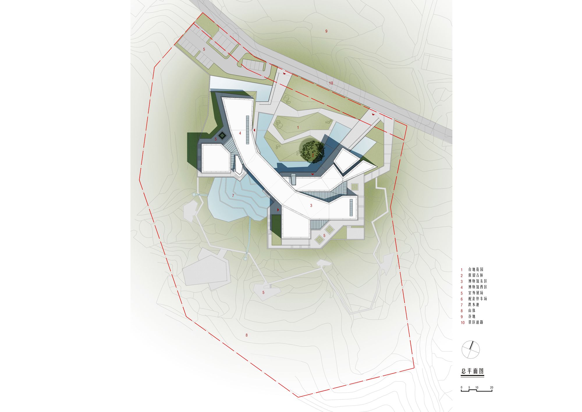 The Sanqingshan Geological Museum draws inspiration from the site’s geological origins and abstract composition to create its architectural design. The design includes the interpretation of the compression and movement of two major tectonic plates, the depiction of mutual interactions between mountains and seas, and showcasing the granite development of Sanqing Mountain characterized by longitudinal, transverse, and horizontal joints, as well as broomstick fissures. The architectural form reflects bi-directional compression, featuring longitudinal fissures and extensions in strips and blocks.