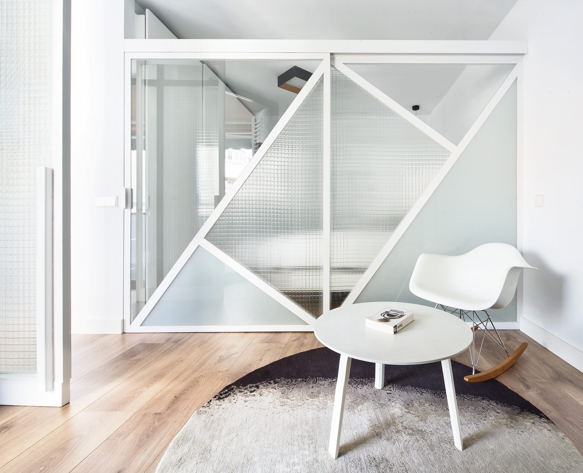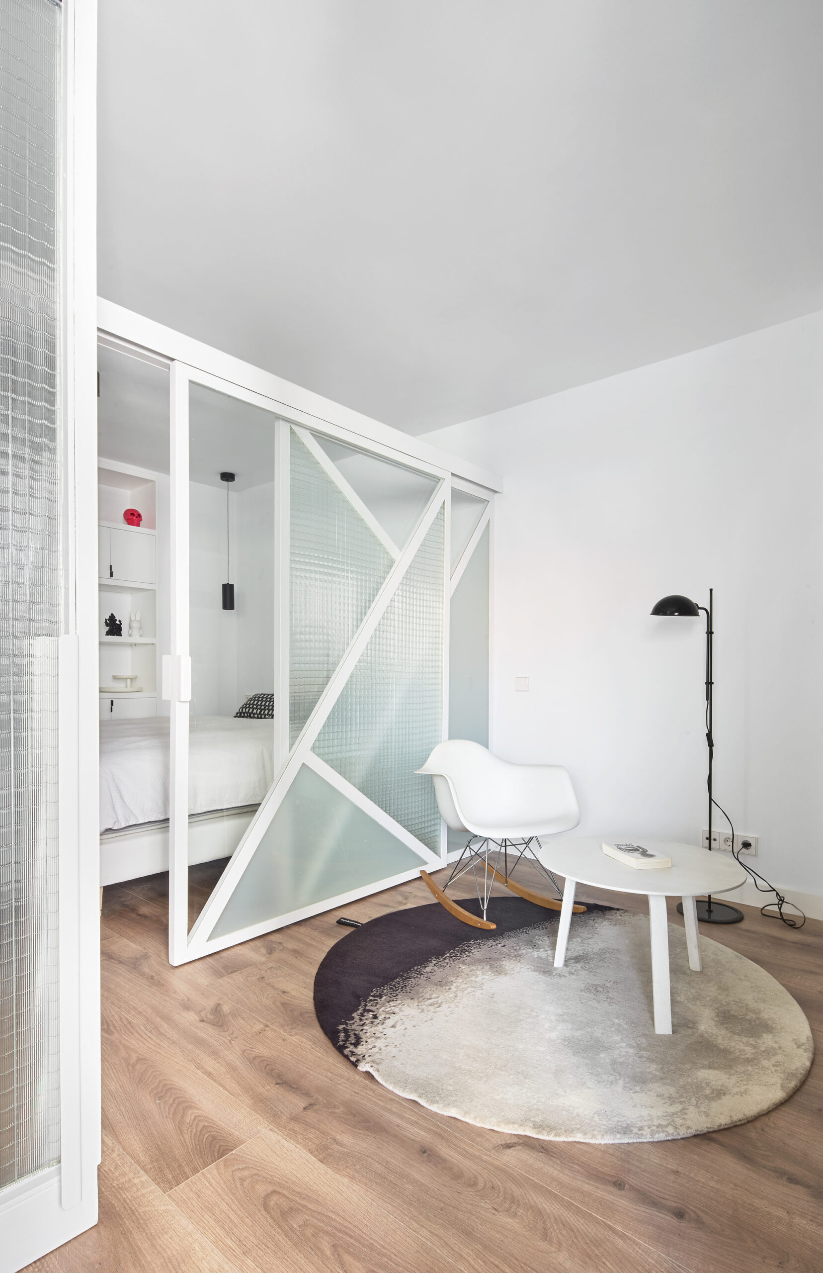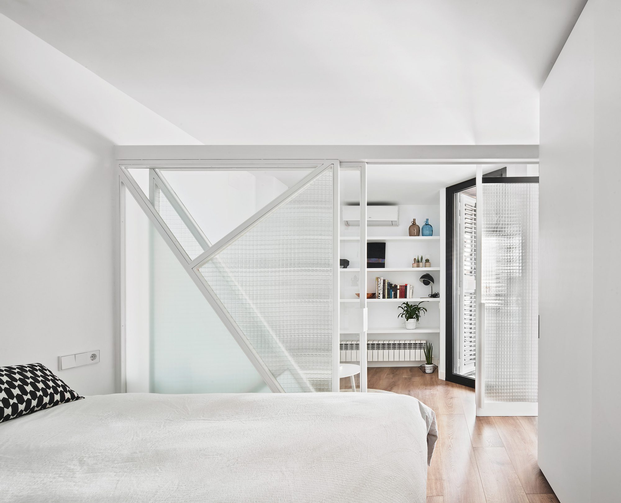 Similarly, the study area is an ambiguous space that connects to the common spaces through a new pivoting door, similar to the previous ones, but this time of glass, which in turn connects to the bedroom through two large sliding doors that also do not reach the ceiling, and that in their composition of different types of glass, draw superimposed figures that blur the dominant axes of the rooms.