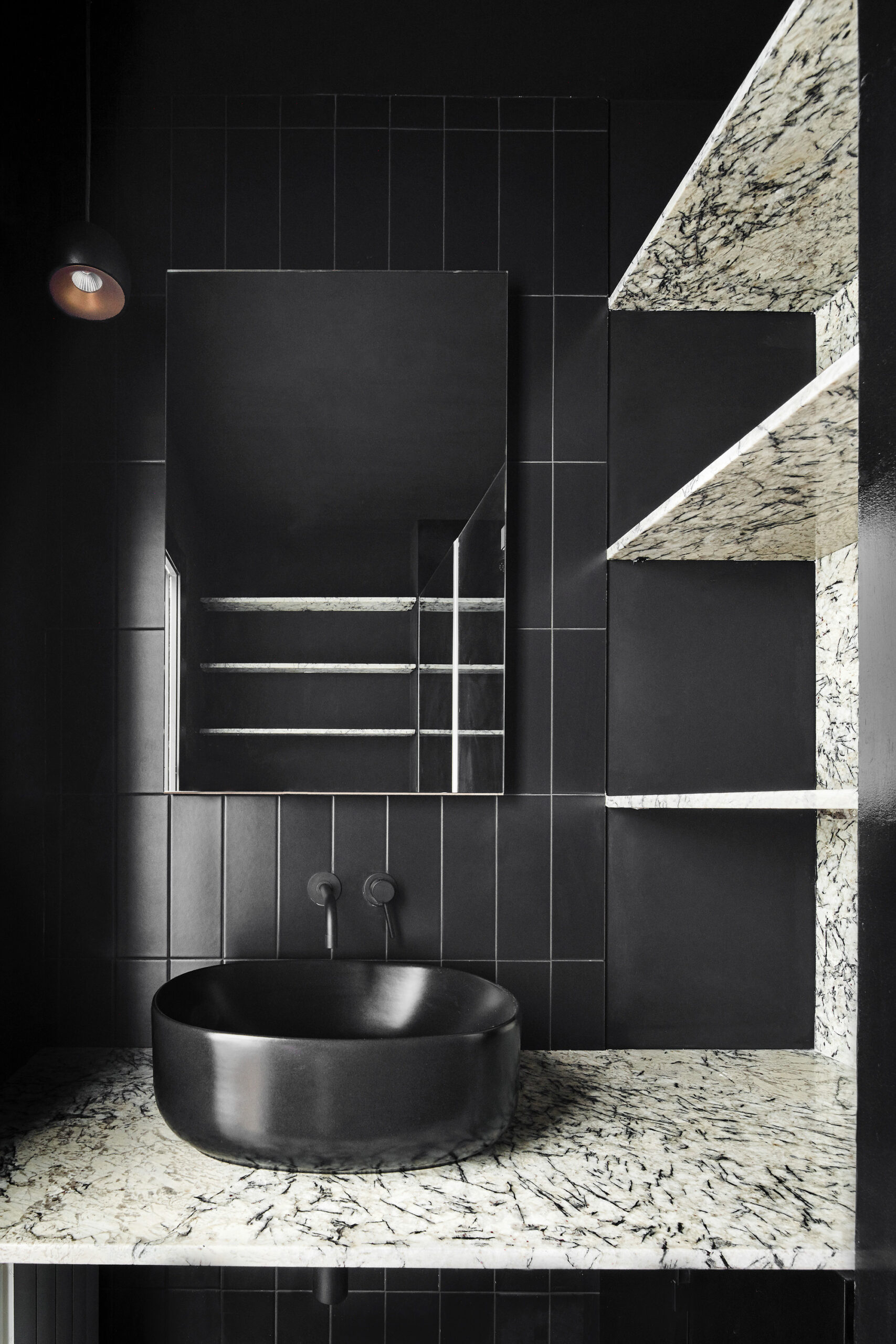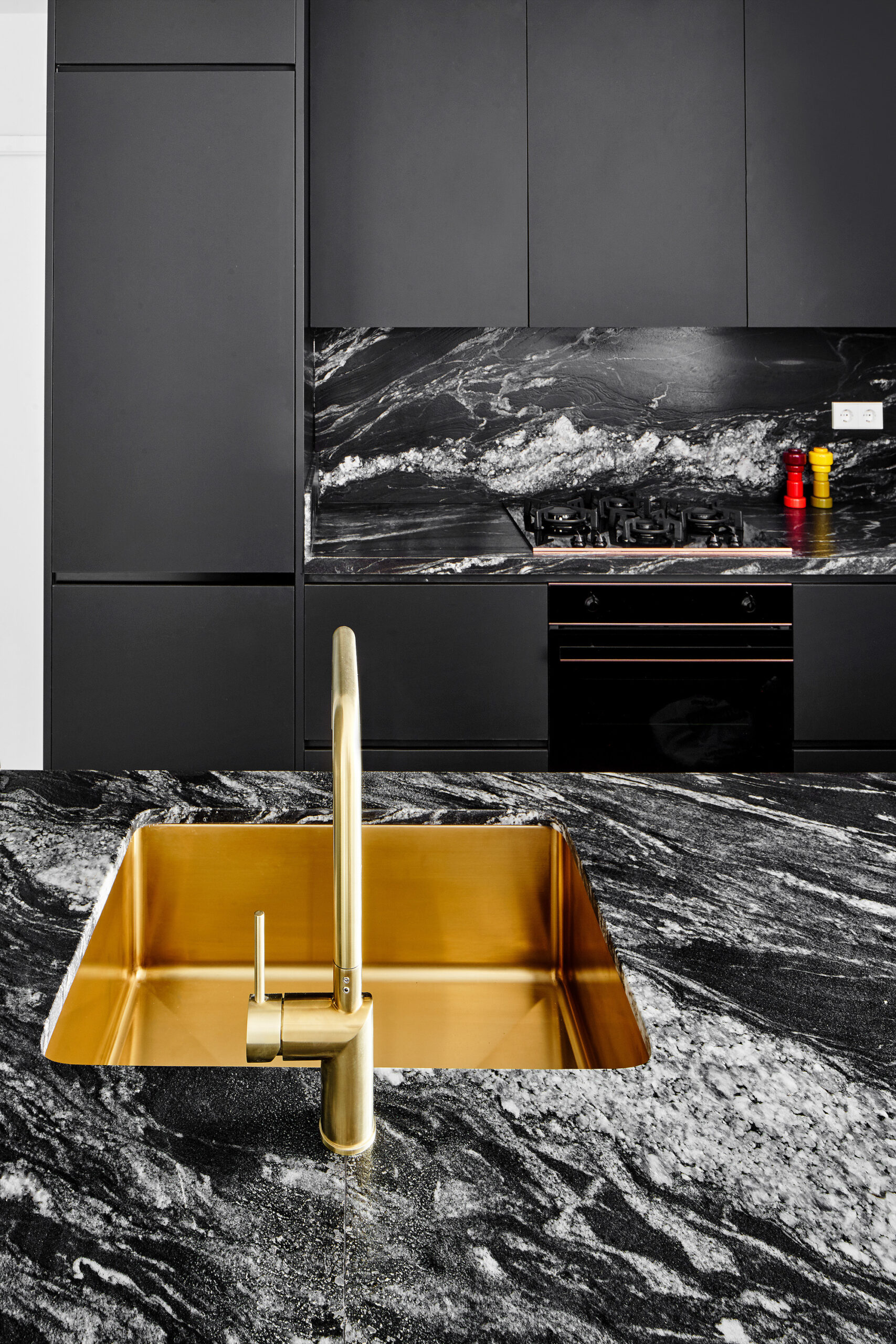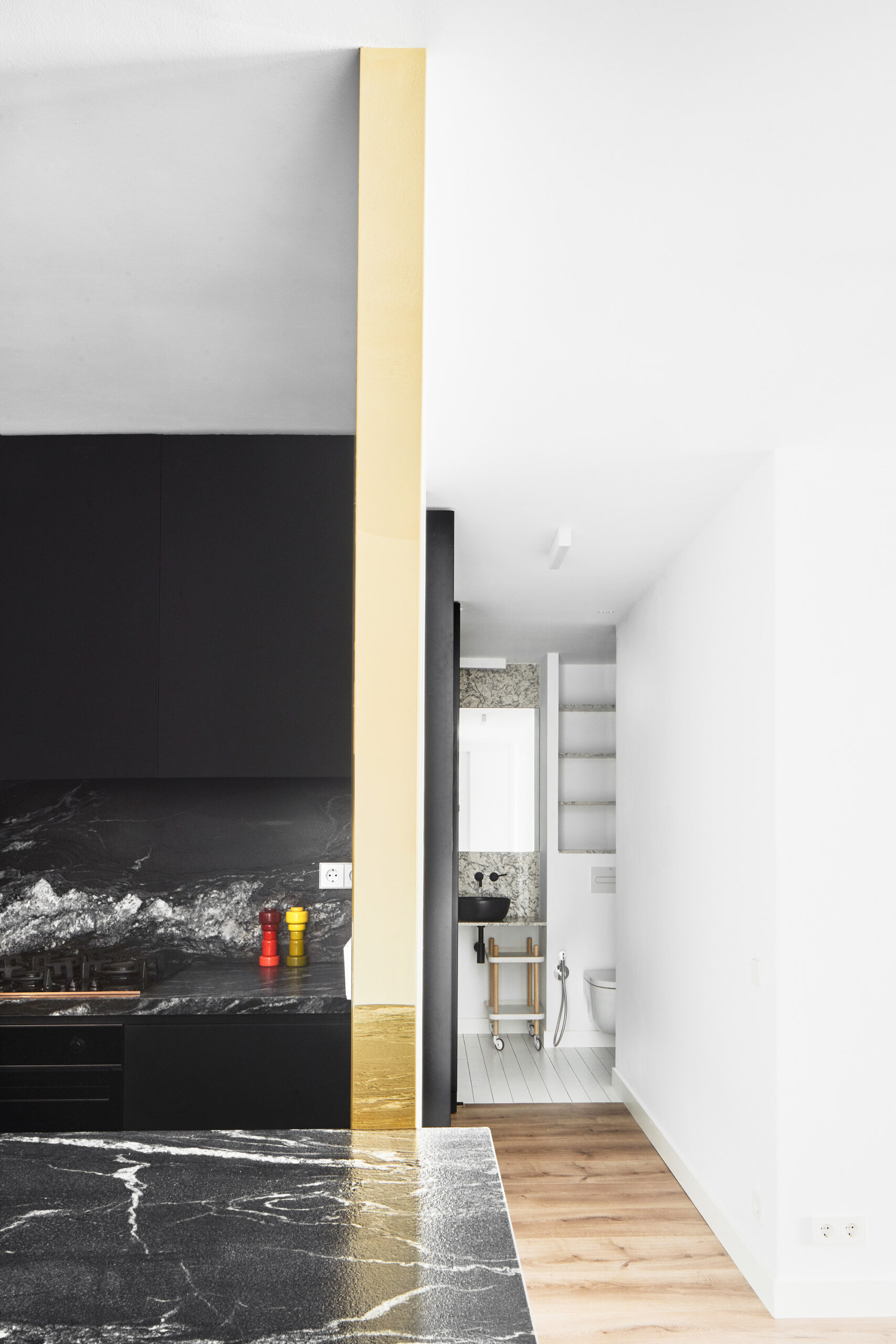 The material treatment accompanies the spatial concept, insinuating the position of each use in rooms that otherwise have no defined boundaries. Although the kitchen is housed in a more or less recognizable room, its color is black, and golden details in brass (the faucet, the sink) contrast the black surfaces; the large pivoting doors of the guest rooms are lacquered in black, and their handles again in brass, highlighting the interruption of the white walls; the bathroom suite is completely black, a mix of ceramic, granite, microcement and black varnish, and with taps, sinks and other accessories all in black.