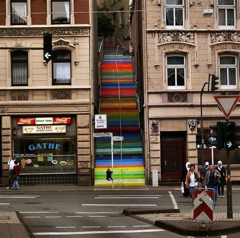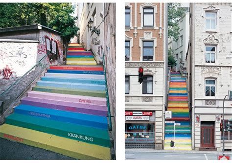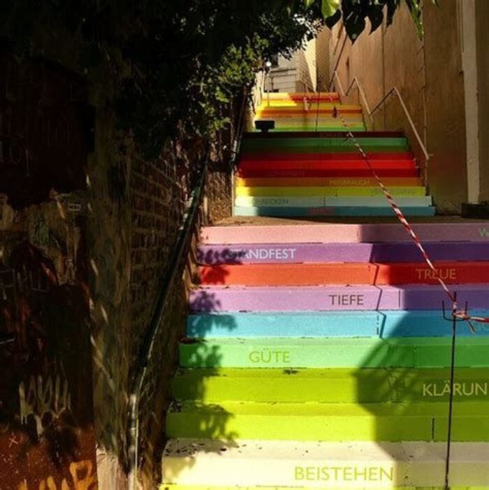 “Scala” is a project of a staircase painted in a rainbow of colors, the project is located in Wuppertal, Germany and consists of 112 stairs, each one has a stenciled word, like love, seduce, sympathy, dance, and passion, which describes the relationships between human beings. The public artwork is called Scala (“staircase” in Italian) and was listed as one of the World’s Coolest Staircases.